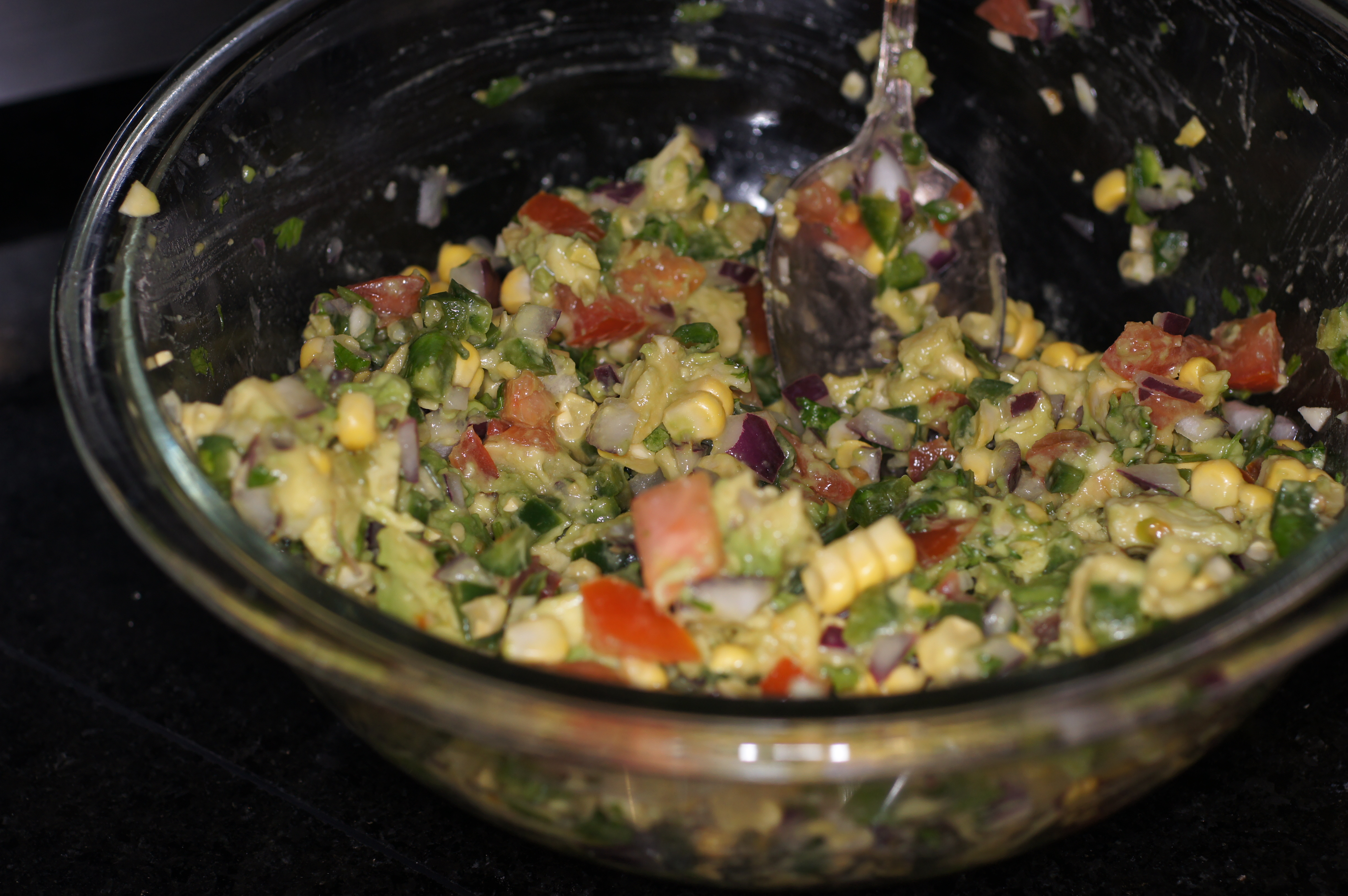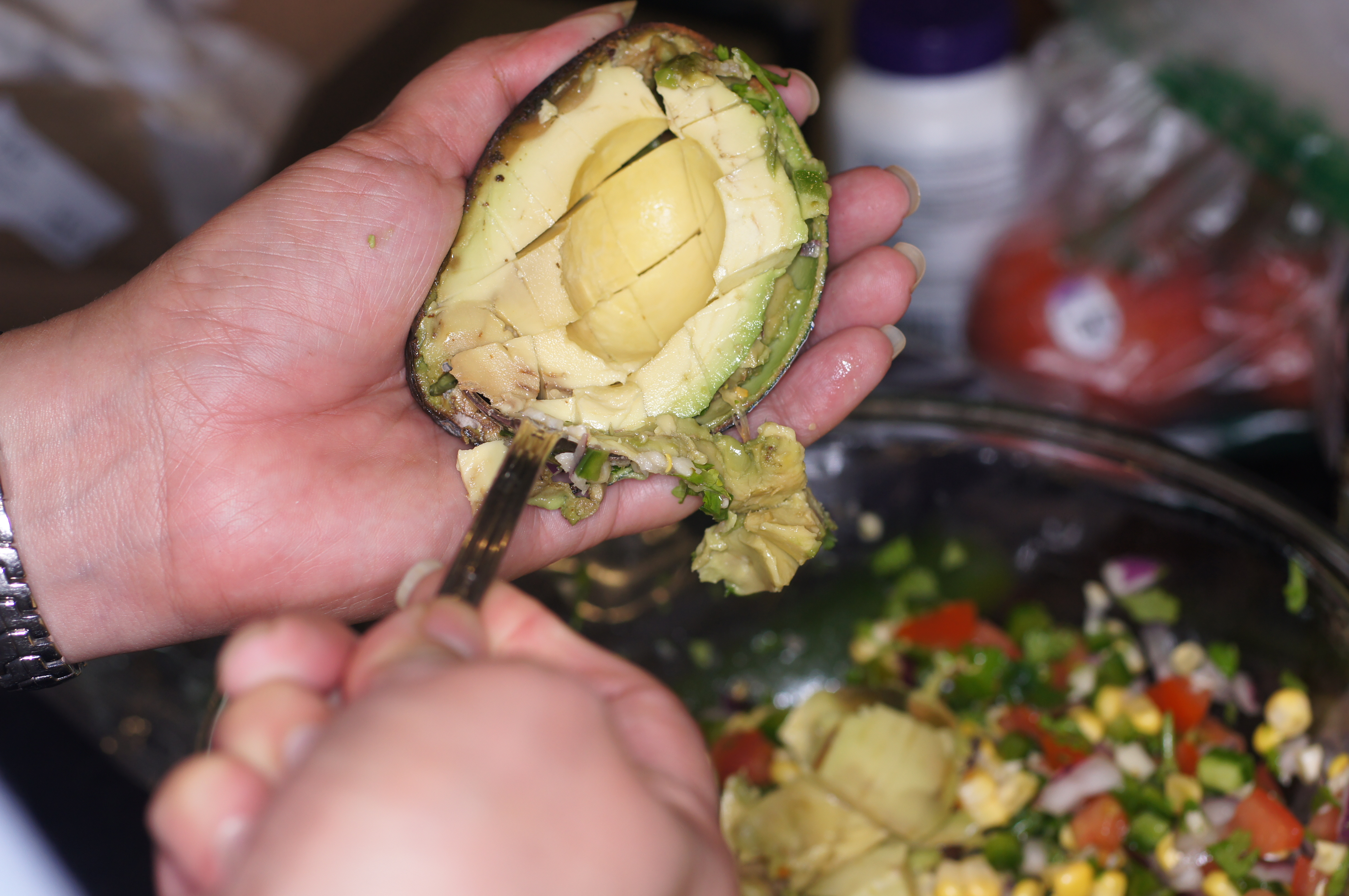 Repeat process with the other half and the other avocado. Once the avocado is completed, gently toss the ingredients to incorporate. You do not want to mash the avocados into a guacamole.