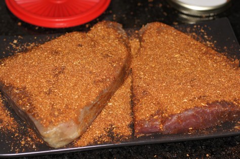 Make the rub (recipe found here), or if you’re like me you have some in the pantry, so get it out. Liberally dust the tuna with the rub on both sides.