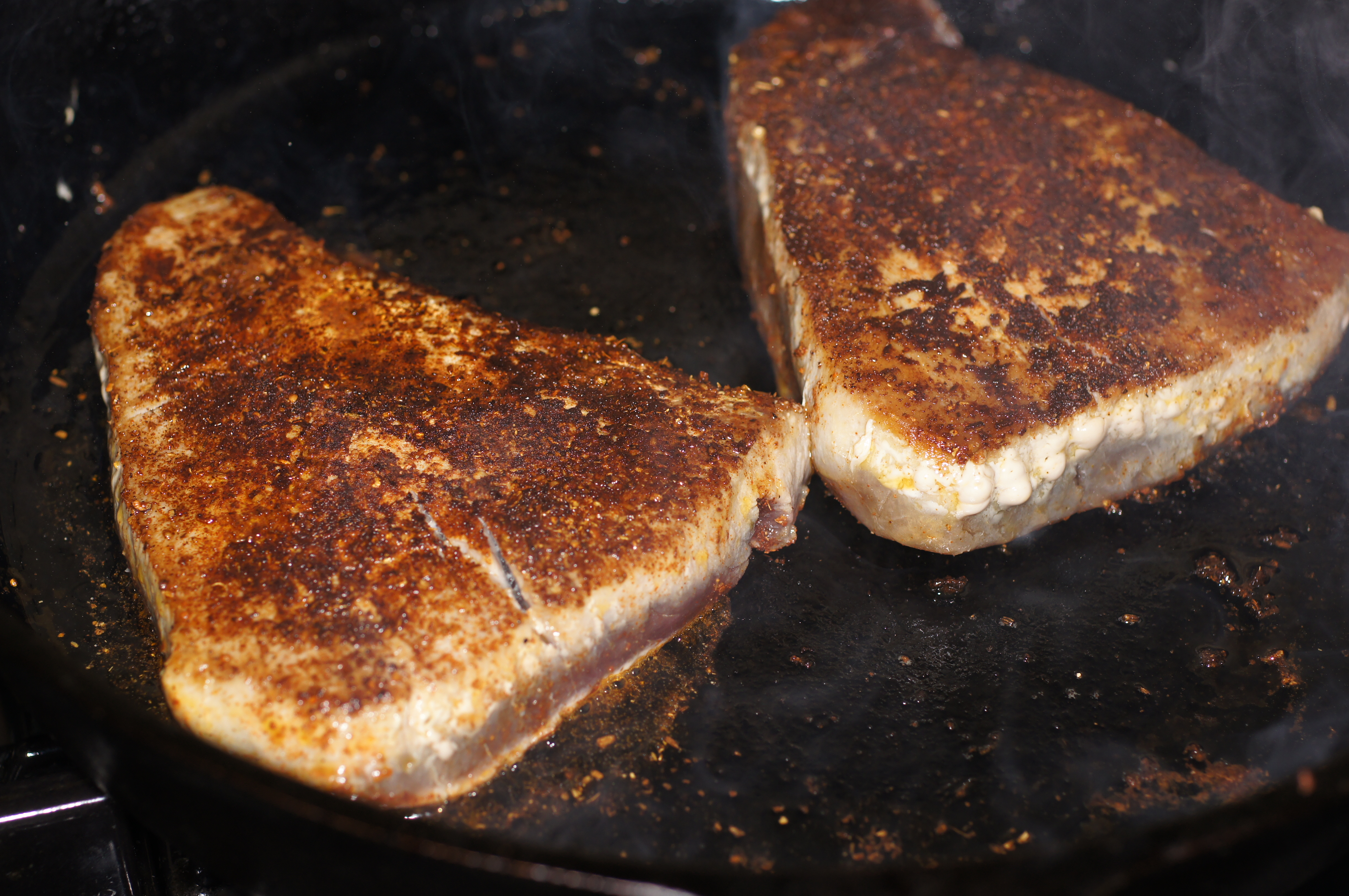 Heat a heavy bottom skillet (preferably cast iron) on high heat. When hot, add the oil and immediately slide the tuna steaks into the pan away from you. Because you are searing the tuna you want very high heat. For this purpose I use my wok burner at 17,500 BTUs and my cast iron skillet. If you don’t have a high intensity burner, put a large lid or another skillet on top of the other skillet. This focuses the heat downward on the skillet as opposed to dissipating the heat upward. This will get you a very, very hot surface. Make sure you have a skillet designed for this as you can actually warp the skillet. With very high heat, the tuna will sear on the outside in 30 – 45 seconds and form a beautiful crust. After 30 – 45 seconds, turn the tuna and sear the other side for another 30 – 45 seconds.
