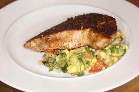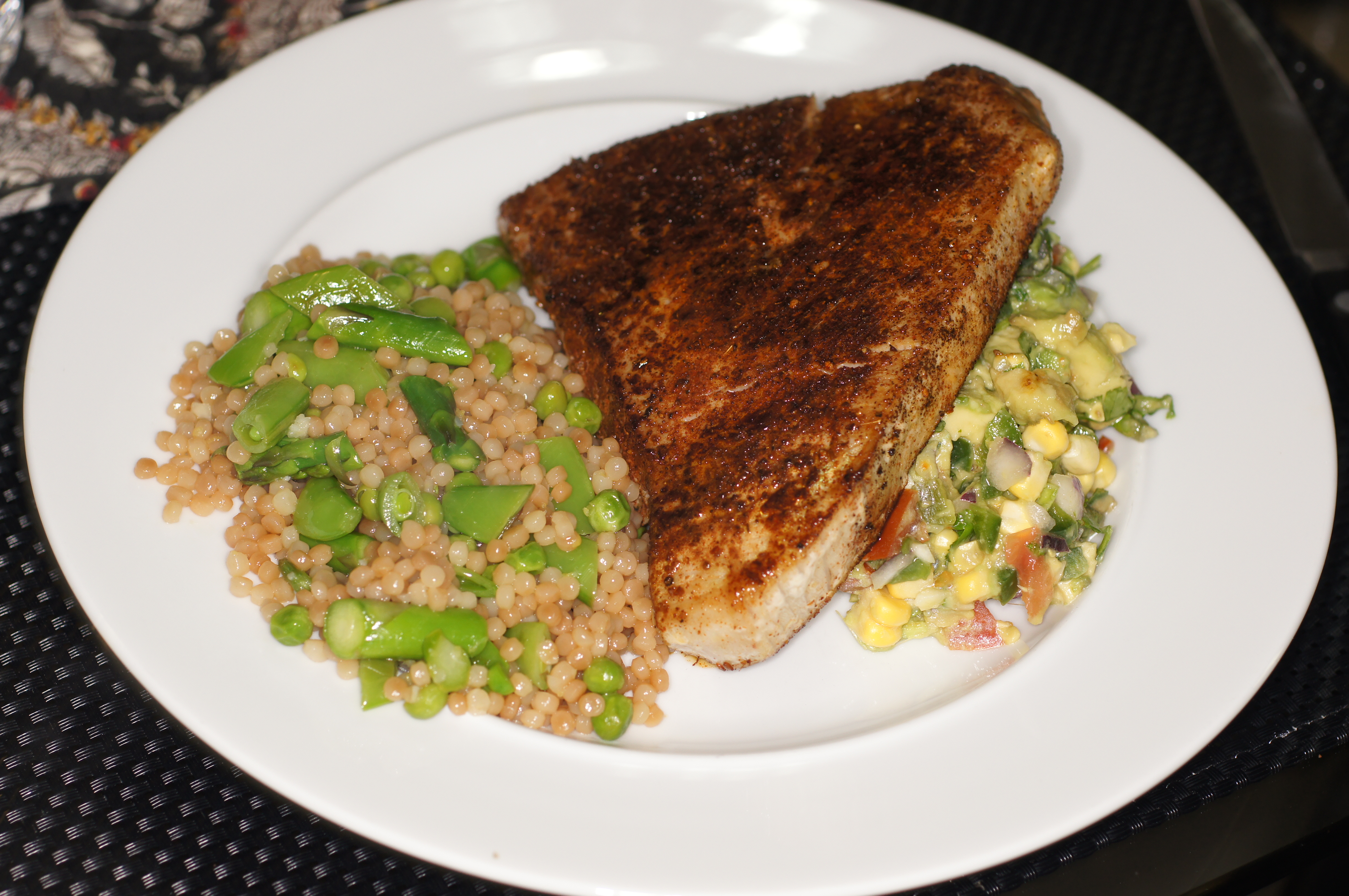 Did you notice the last photograph on the post Israeli Couscous with Sugar Snap Peas & Asparagus? It showed the complete meal, something like the above photograph but Baby Lady & I can no longer eat 10 oz of tuna (it’s that aging thing) so we split ours in half. This post is really about the totality of the meal. As you should know by now, I love tuna, especially Big Eye Blue Tuna. I buy it fresh in bulk, vacuum seal it, freeze it and eat it as quickly as possible. I have also mentioned this beautiful earthy ancho chile rub. Last night’s meal was a meal in complete harmony. You had the wonderful meaty flavor of the tuna coupled with the earthiness and spice of the ancho rub, the creaminess, spice and acidity of the avocado salsa with the floral component of the cilantro, and the nuttiness and soft chewy texture of the Israeli couscous with the tang of the lemon, crunch of the al dente veggies, and sweetness of the corn and sugar snap peas. What a wonderful meal! I just had to share the whole meal.
