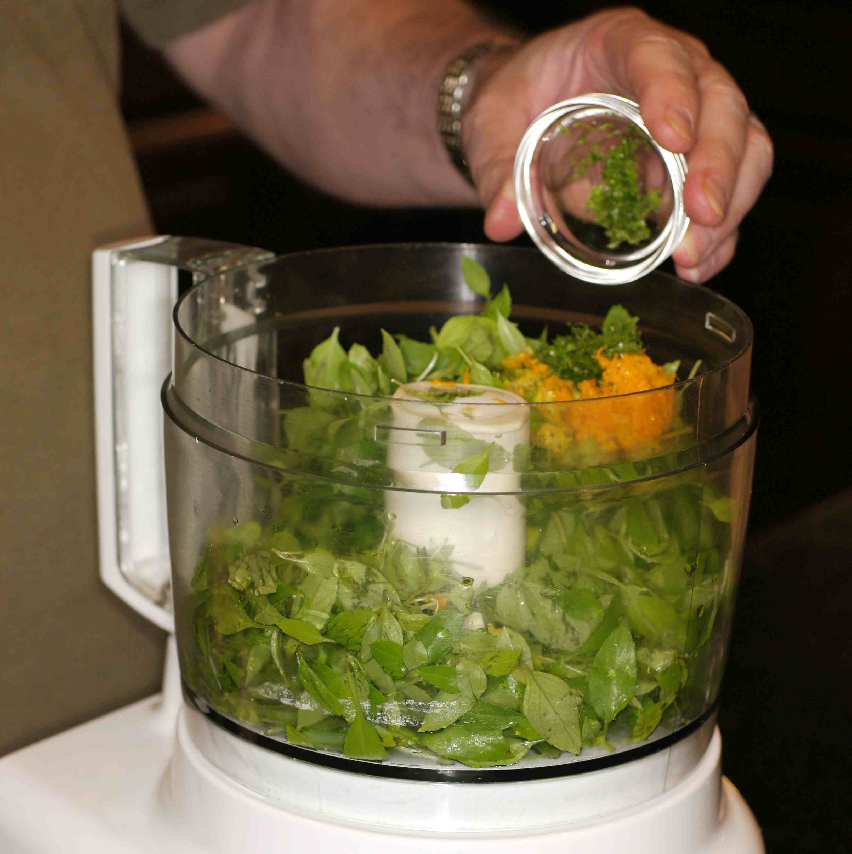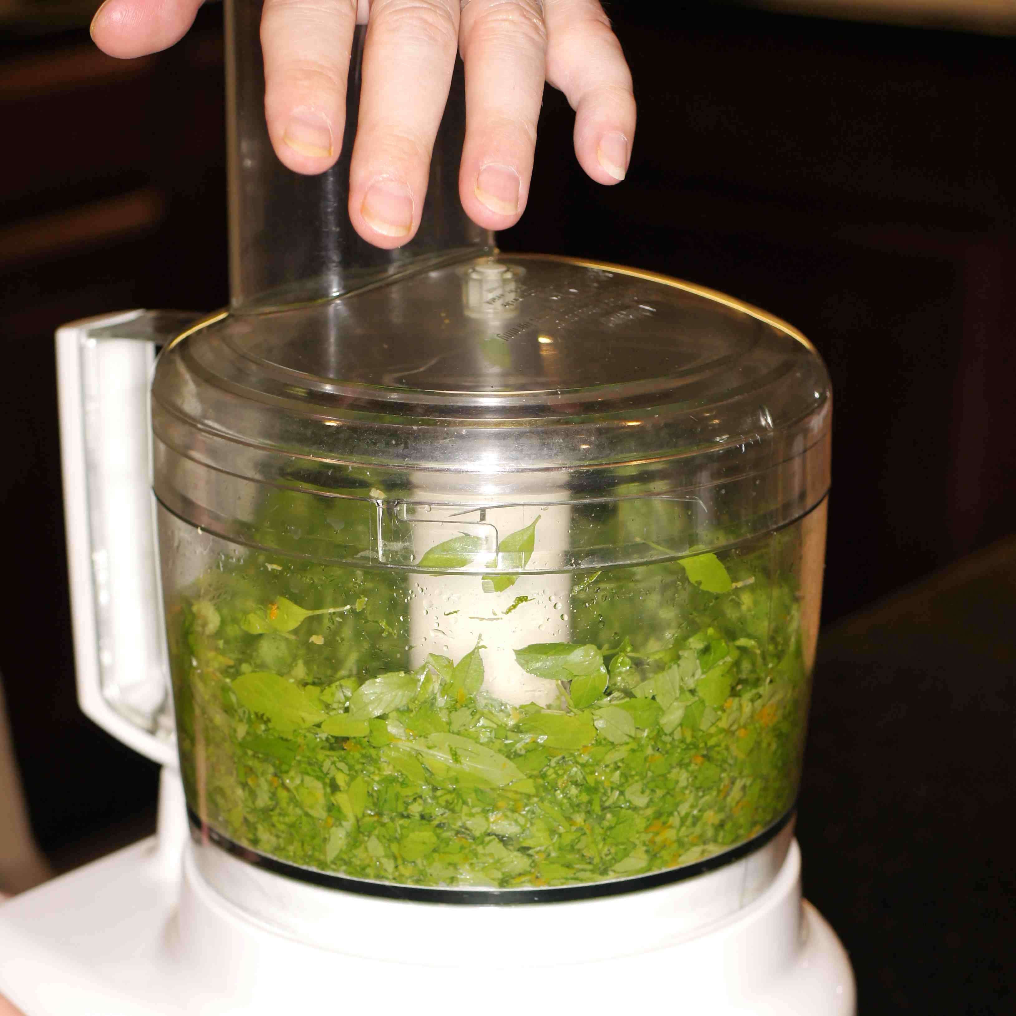 While the spaghetti squash is baking, go ahead and make the Citrus Pesto. Place the basil in a food processor.