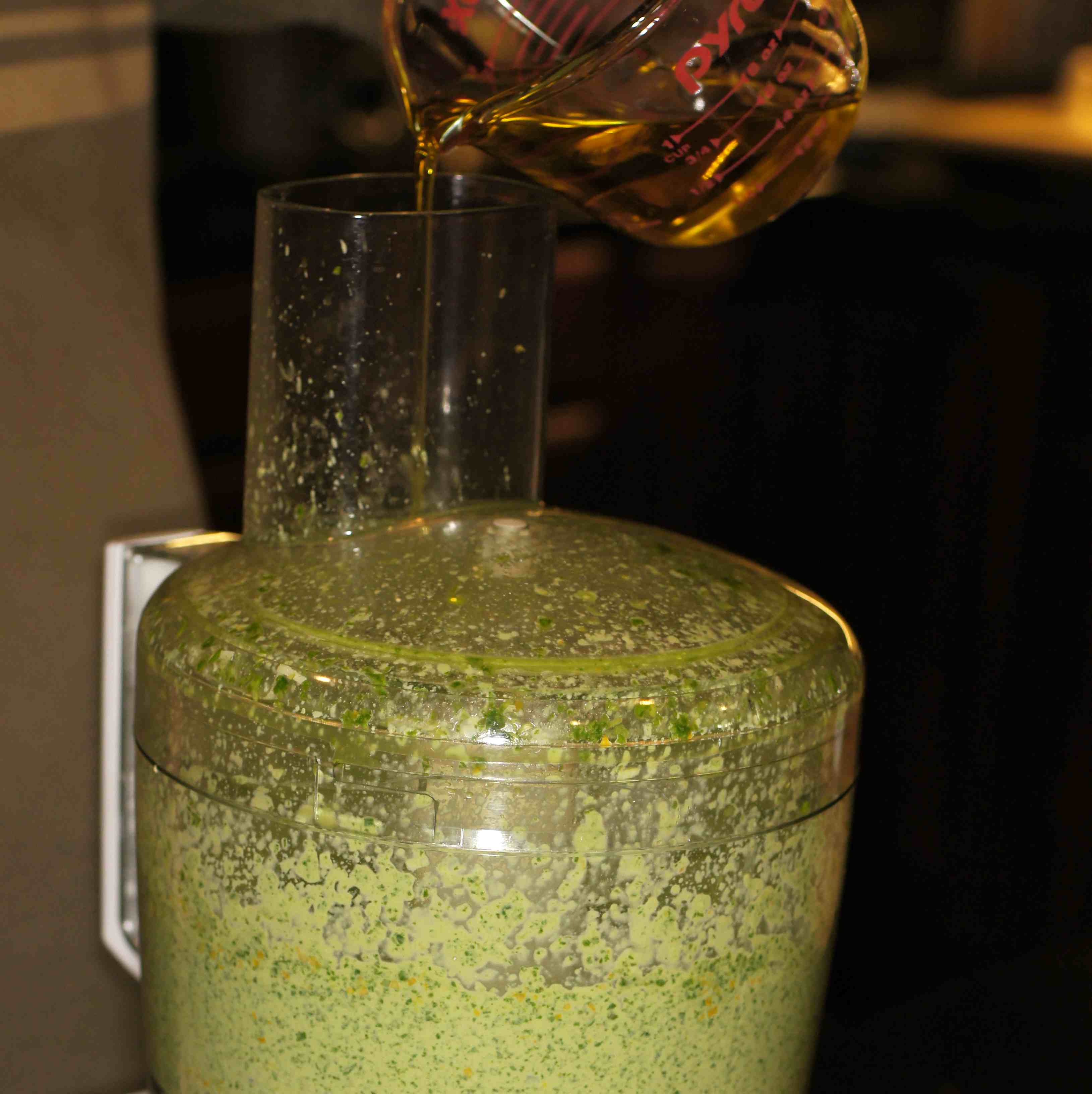Pulse again to incorporate. Now, add the olive oil while the food processor is running to fully incorporate and puree the mixture.
