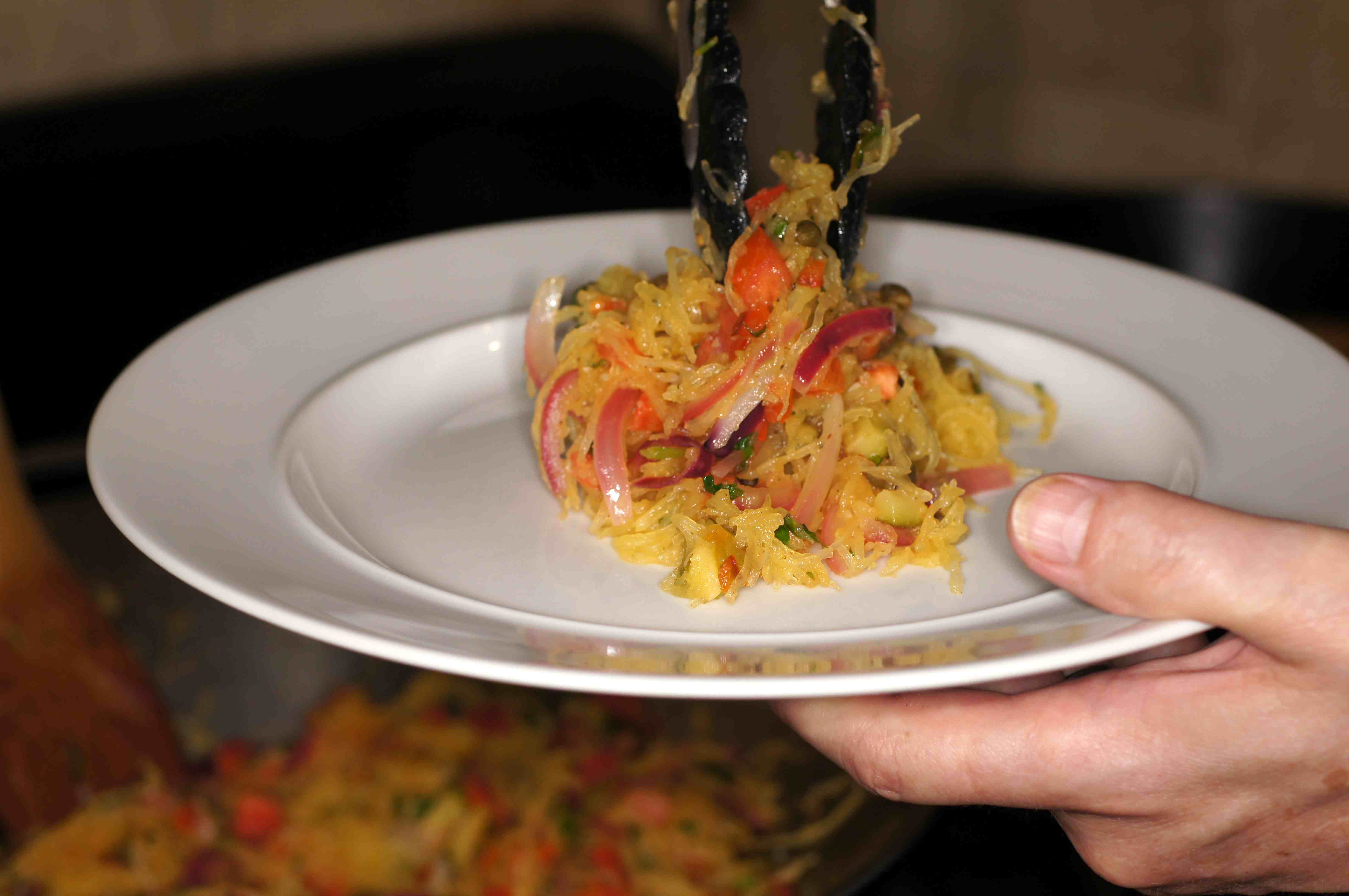 Put a bed of the spaghetti squash in the middle of the plate.