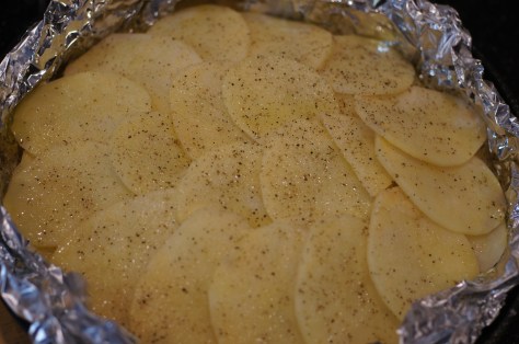 Once you hace sliced all of the potatoes brush your 9 inch pan with 2 tablespoons of melted butter. Build the first layer by placing the slices in in an overlapping concentric circle, spray with olive oil misting spray and season with salt, freshly ground black pepper and a light dusting of garlic powder. Build the next payer in the same fashion, except on the second layer and every layer thereafter until the top, add the chopped chives.