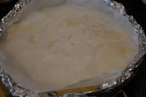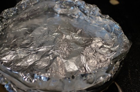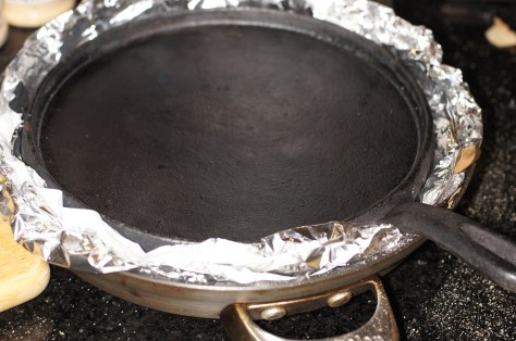 Place a heavy oven proof pot on top of the aluminum foil to weigh down the potato. We have a cast iron comal which works beautifully.