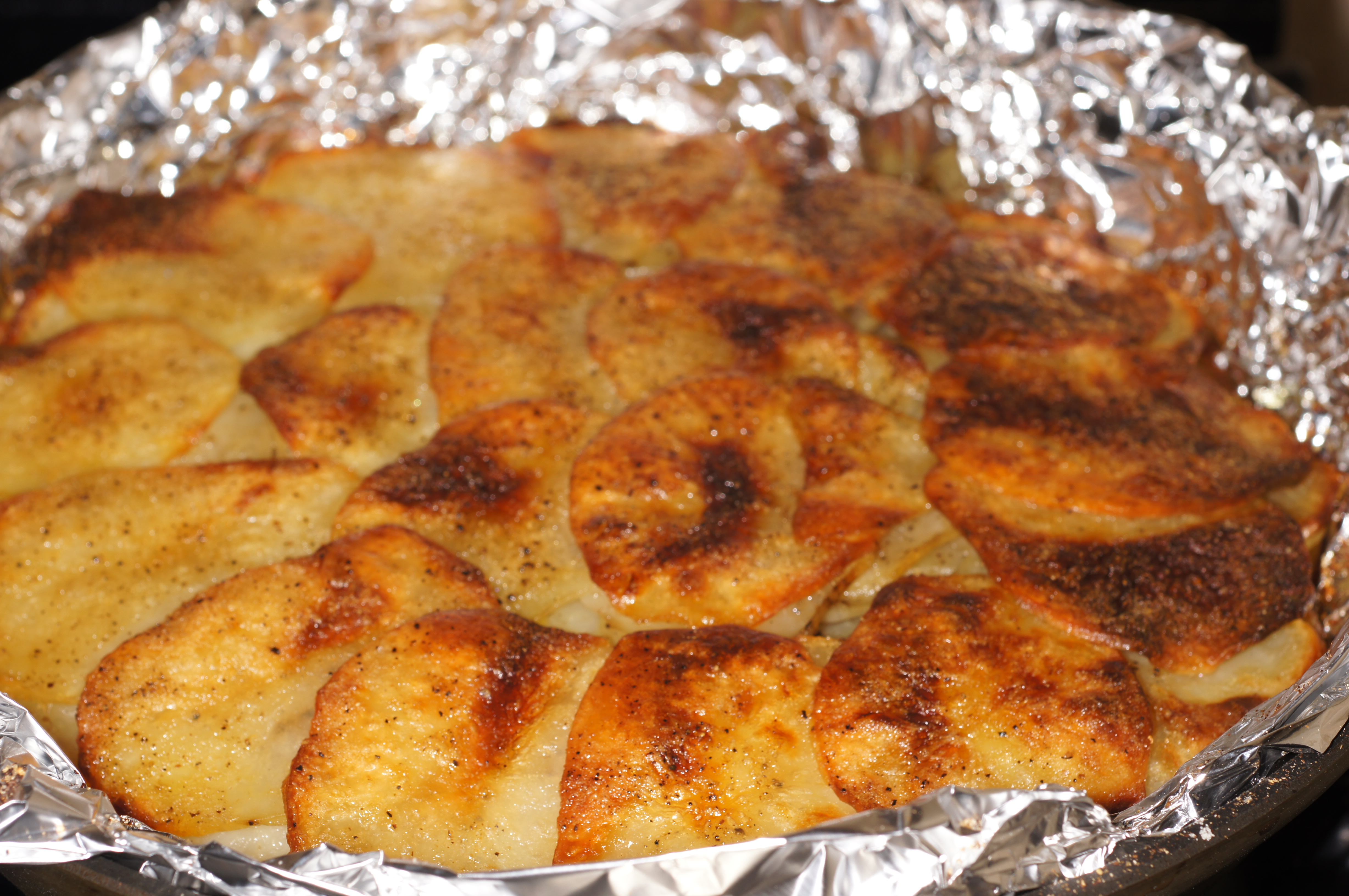 Pommes Anna (Anna’s potatoes in English) is a classic French dish of sliced, layered potatoes cooked in a melted butter. Carbs + Butter, remember, I gave you fair warning. To help with the carb and calorie load I use Olive Oil misting spray. It gives a light coating of oil on each layer which is what you want. If you brush the oil on the potatoes you don’t get as even a coating and you use more butter/oil resulting in an oily dish. Also, this is not that simple of a recipe despite what you read! It seems simple enough, just slice potatoes, layer them in a pan with butter and salt, put in the oven and ignore for 30 minutes. The trick, however, is getting that nice crispy top and little crispy edges. It will be good even if you don’t get the crispy top but the crispy top adds a beautiful crunch to your meal.