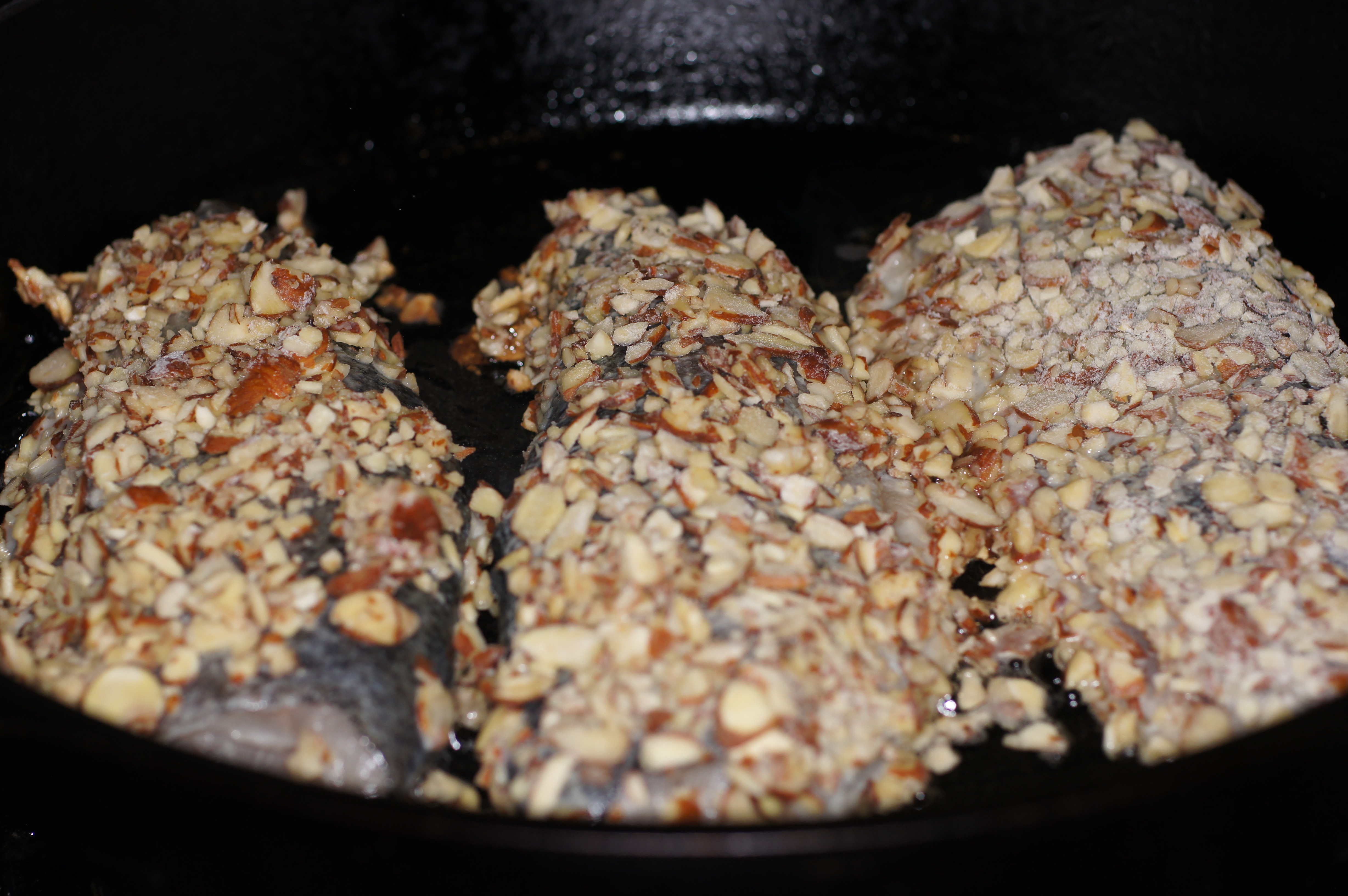 Pan fry the filet for 3 minutes on one side or until almonds begin to turn a light brown. Flip and pan fry the other side for 3 minutes. After 3 minutes, remove from heat and finish in the oven at 350 F for roughly 3 minutes.