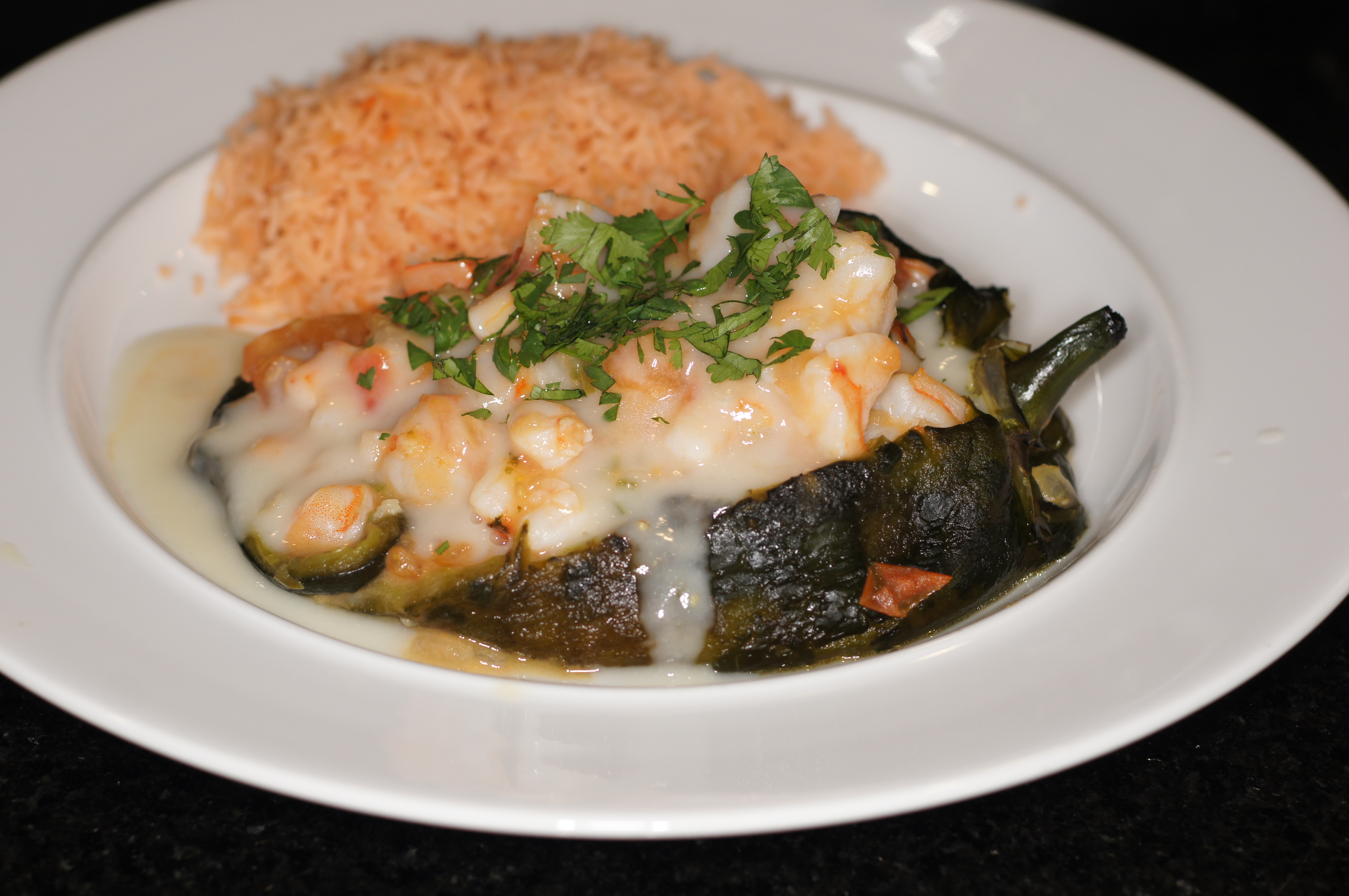 Place Poblano chile on plate with rice. Spoon 3 Tablespoons of sauce over each Poblano and sprinkle with chopped cilantro for garnish. Serve & enjoy.