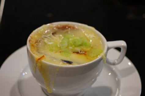 When you’re ready to eat, preheat the broiler. Toast the bread and cut out the rounds. Ladle the soup into bowls (or mugs)