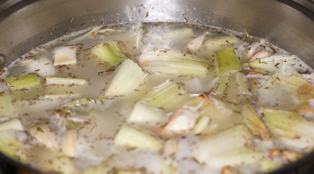 The previous post concerned making a good beef stock, a critical essential to soups and sauces. This post concerns making a good chicken stock. While many of you already know how to make basic stocks, there are others that don’t so I decided to put these basics on the blog, especially since I had to make them for the French Onion Soup recipe.