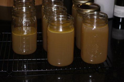 Once you active the desired richness, remove from heat and strain through a fine sieve (I use a fine mesh Chinois) and muslin. Place in quart jars and store for later use. Typially, I get anywhere from 5 – 6 quarts of rich stock out of 2 chicken carcasses.