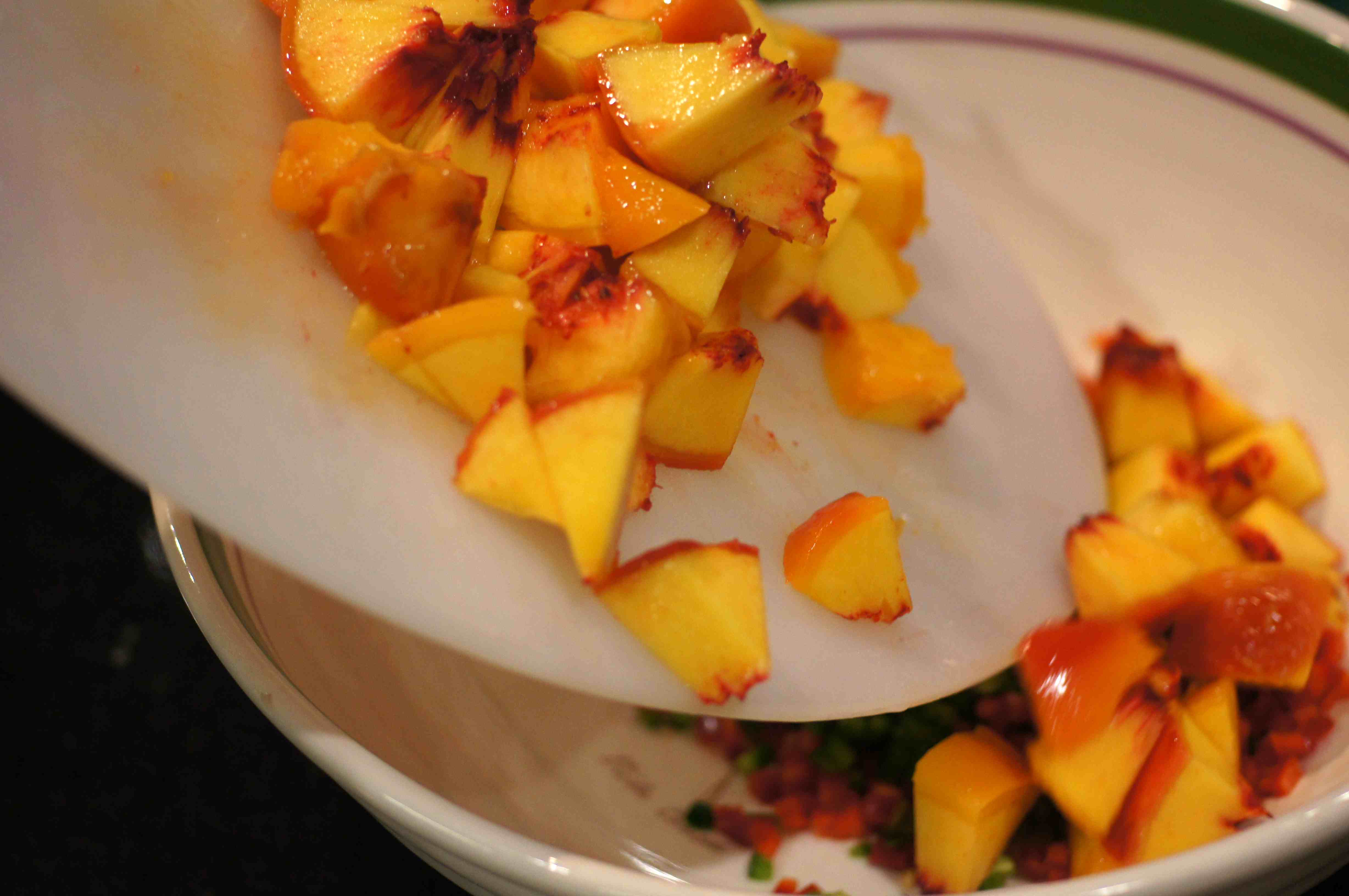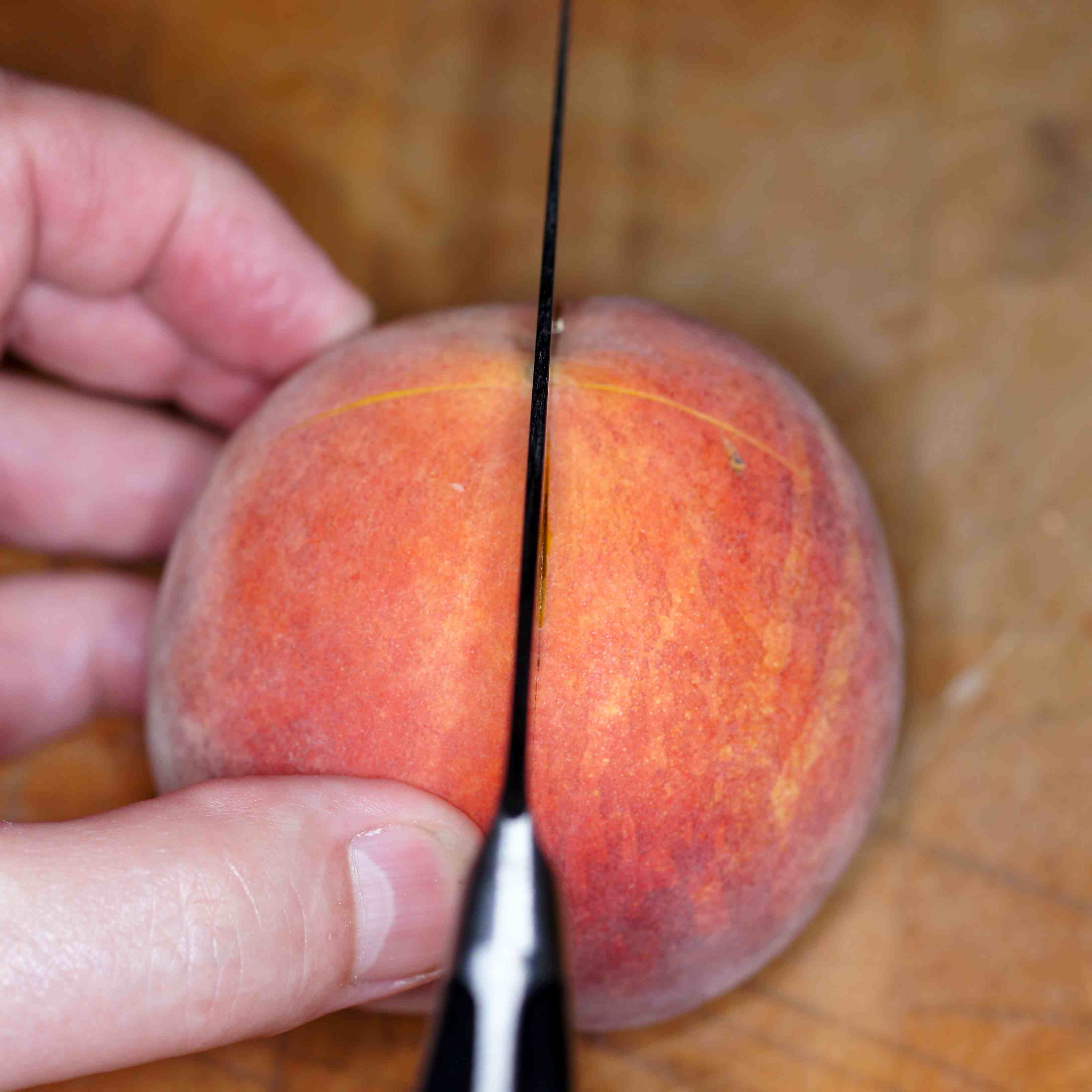 Peel and stone the peaches.  Start by making a shallow X cut through the skin of the peach on its end.