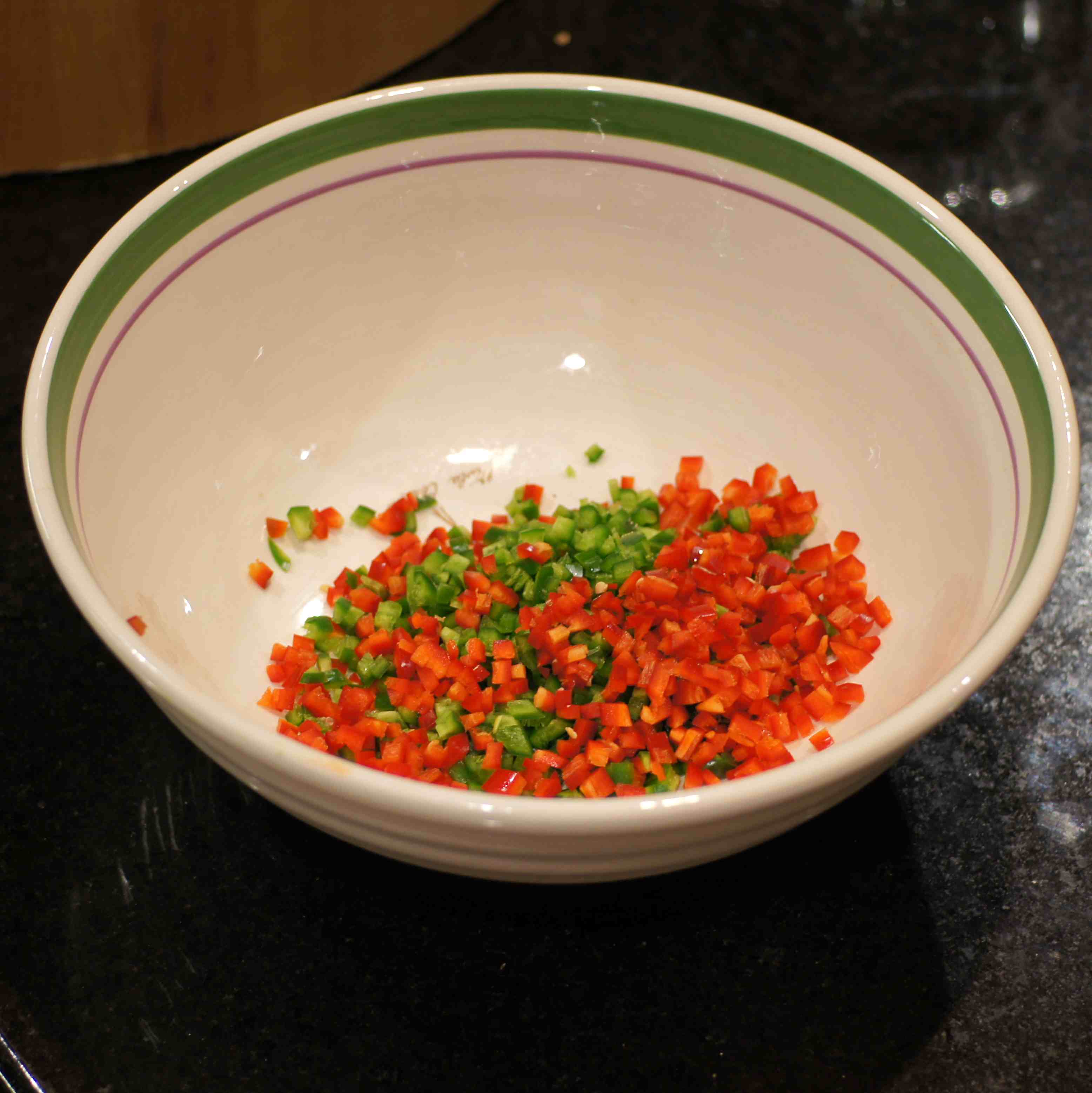 Stem and seed the jalapeños, cut the into small dice and add to a large bowl.