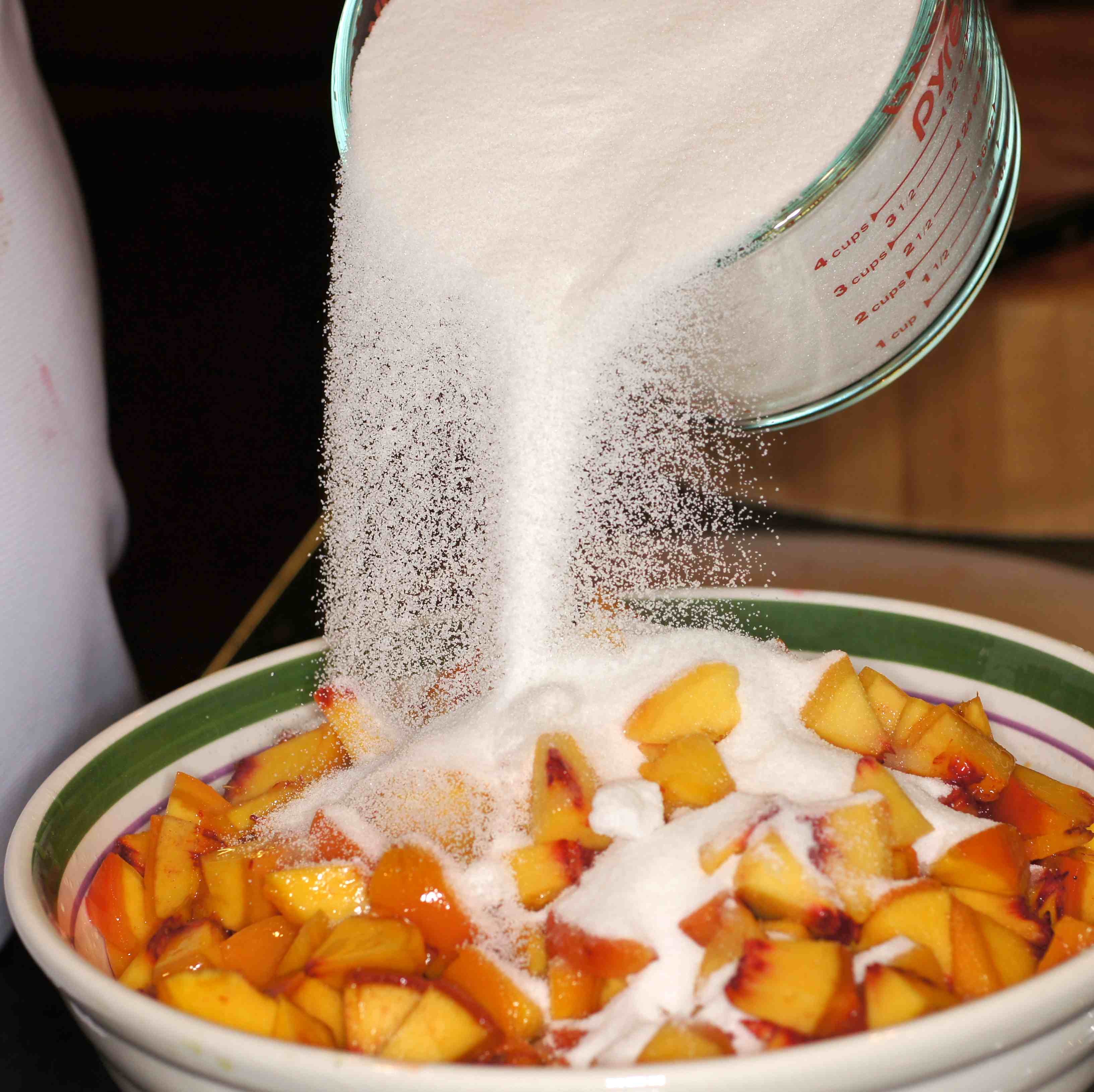 Once peeled, slice the peaches into pieces roughly 1/2 an inch thick.