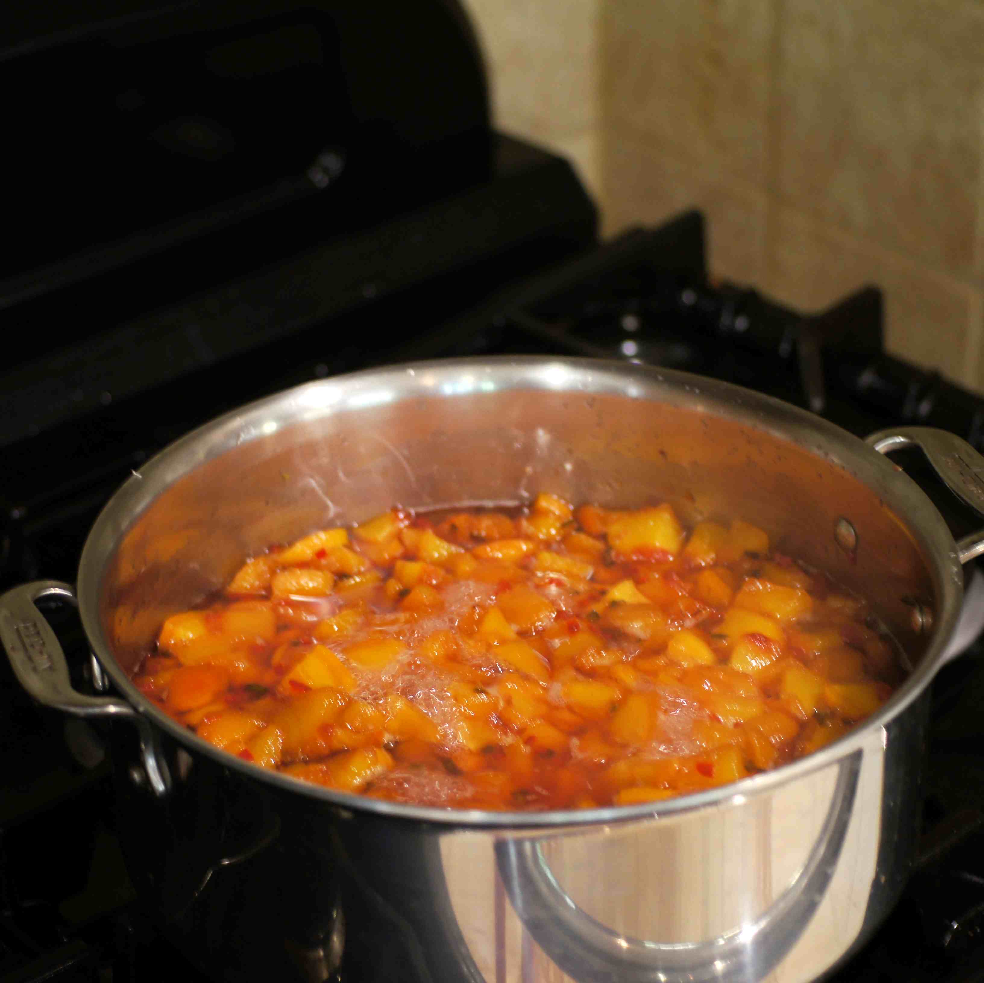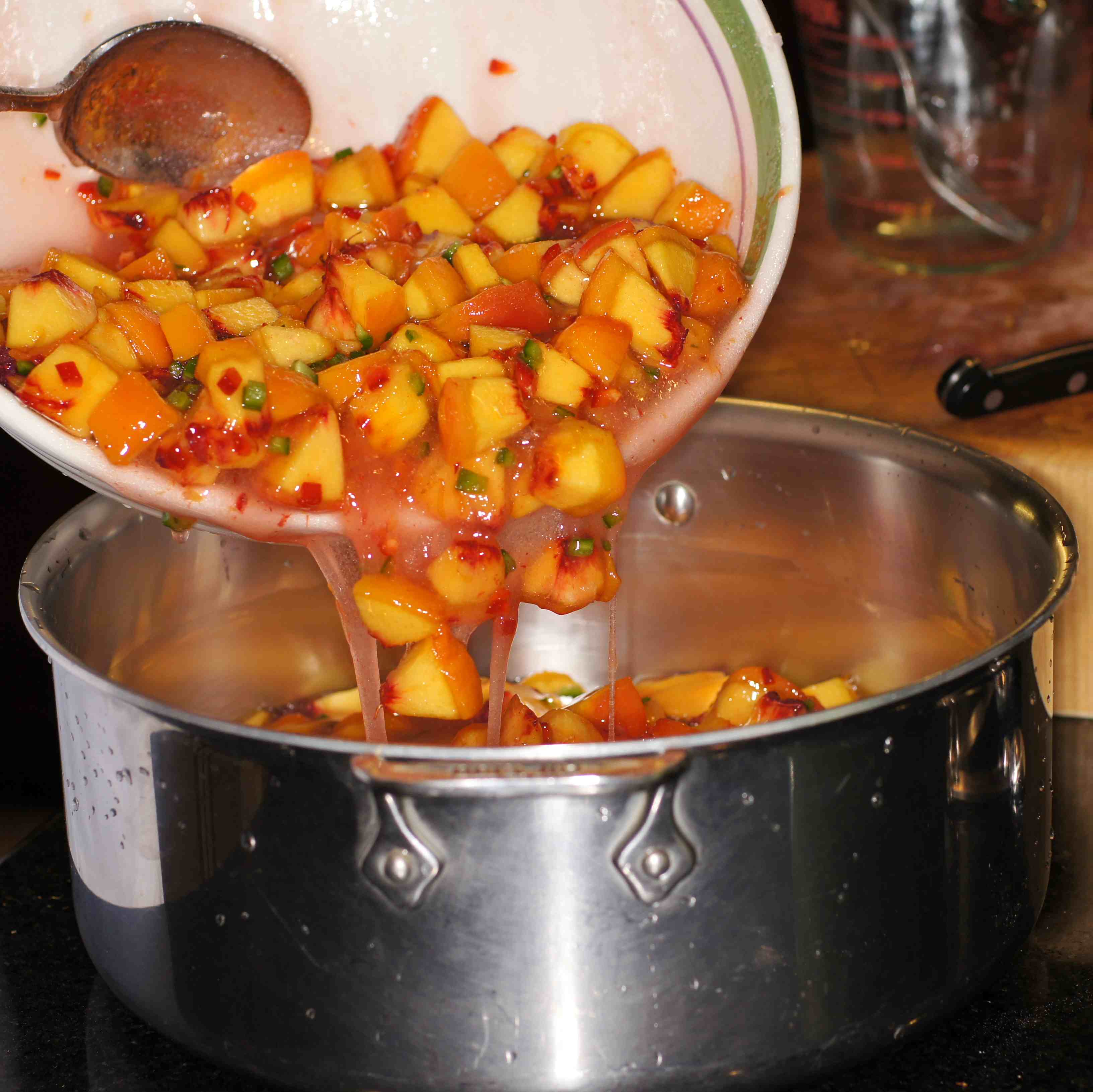 The peaches should become quite tender and the juice should thicken to be more syrupy.  Remove from the heat and let sit for several hours more to further plump the peaches.