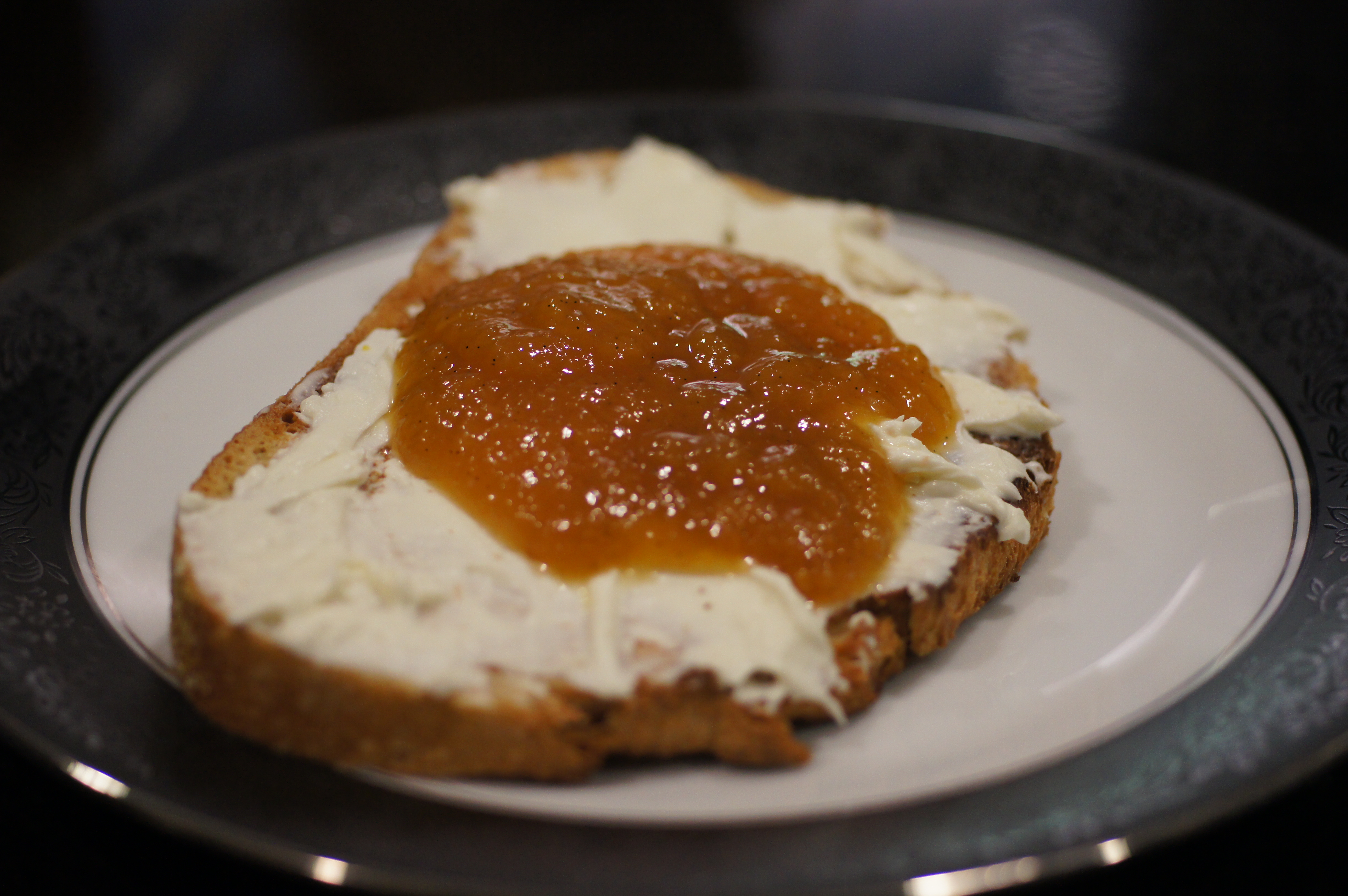 The problem with peaches is you can get carried away when you buy them, like buy a bushel of peaches when there are only 3 of you in the house and only 2 of you eat peaches. Hmmmm… Peaches spoil quickly so you have to do a lot of things with the peaches so you can use them up. This is when I make a lot of preserves of differing kinds, like this beautiful, delicious Vanilla Peach Butter. A piece of sourdough bread toasted, smeared with cream cheese and topped with this vanilla peach butter is a wonderfully delicious start to your morning.