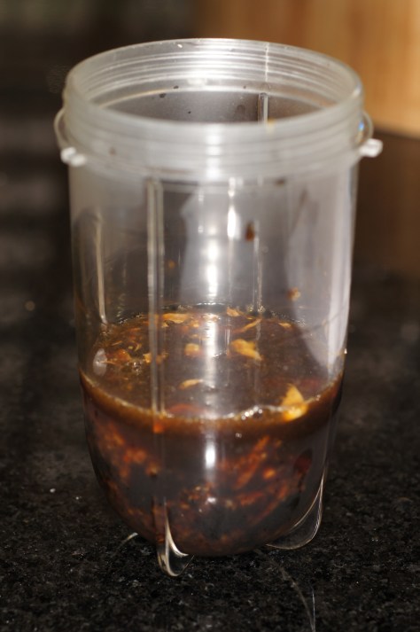 Make the soyu sauce. Take the soy sauce, honey, water, lime juice, fish sauce, sambal olek, lemongrass, ginger and garlic and place in a small blender.