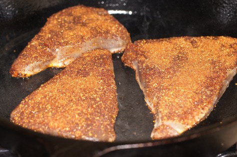 Season the tuna with the ancho chile rub. Heat a heavy bottom skillet over high heat. Add 2 tbsp oil to skillet and coat bottom. Add tuna steaks to the pan.