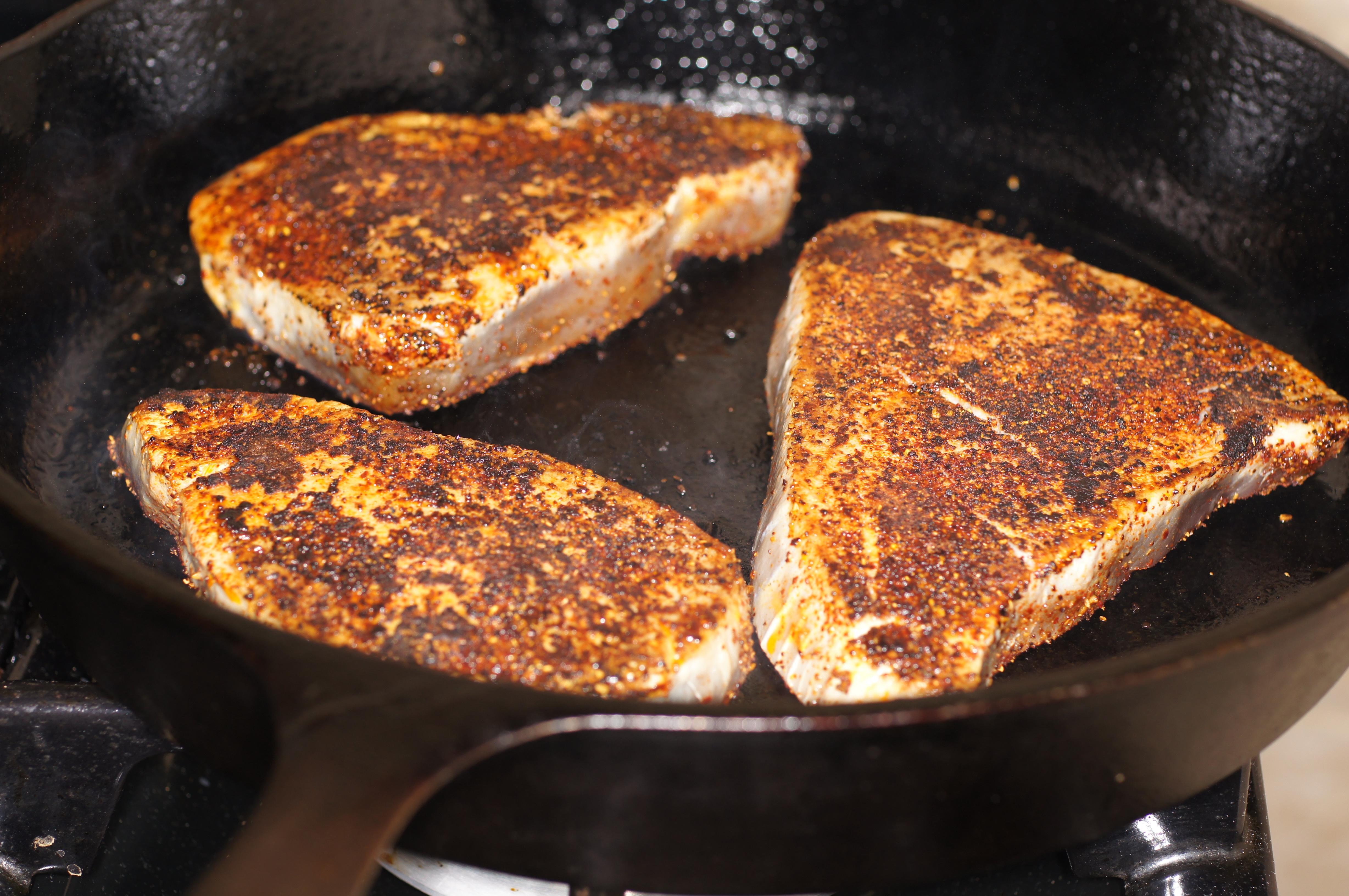 Sear tuna steaks for 45 seconds. Turn to sear the other side.