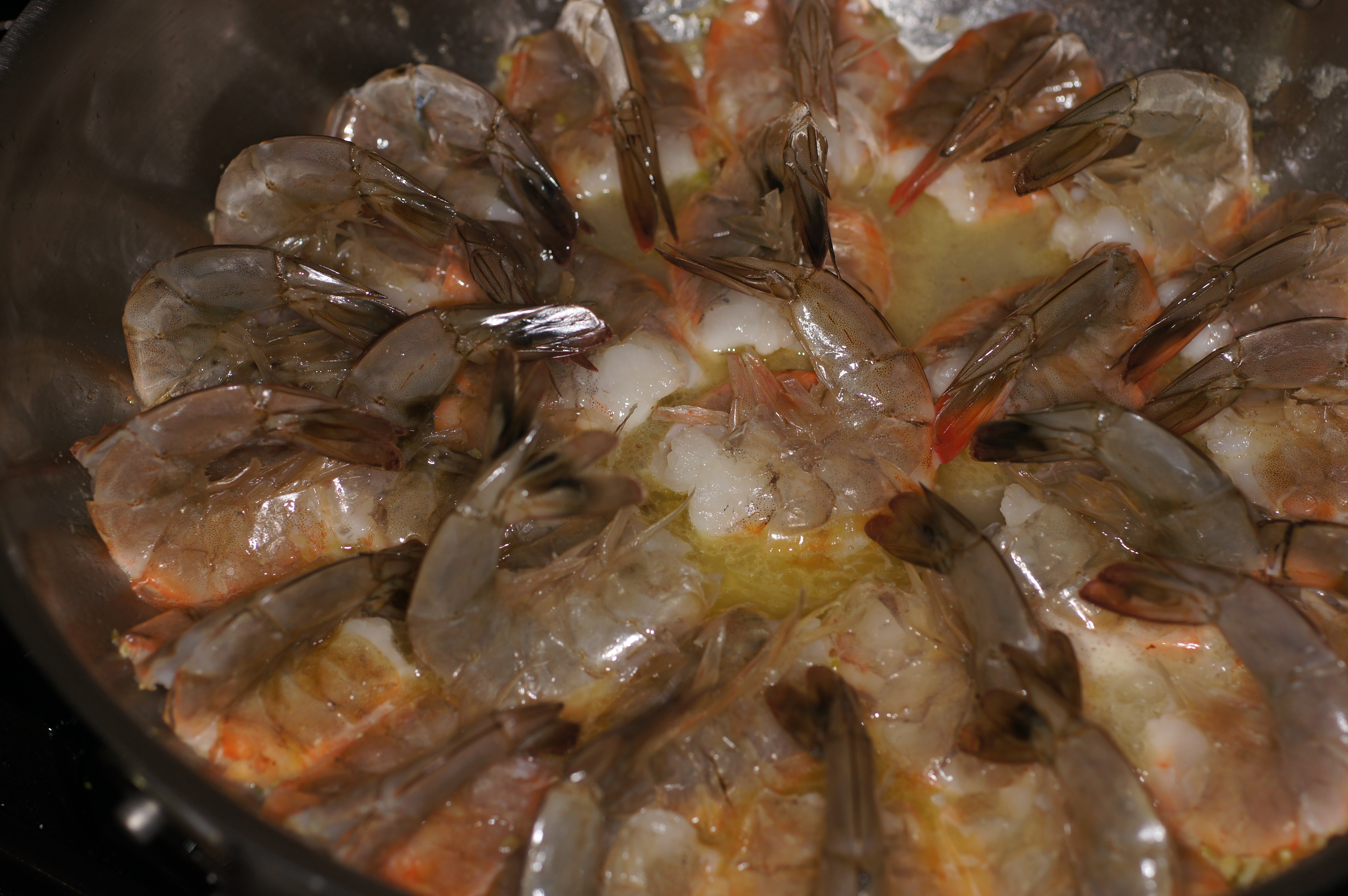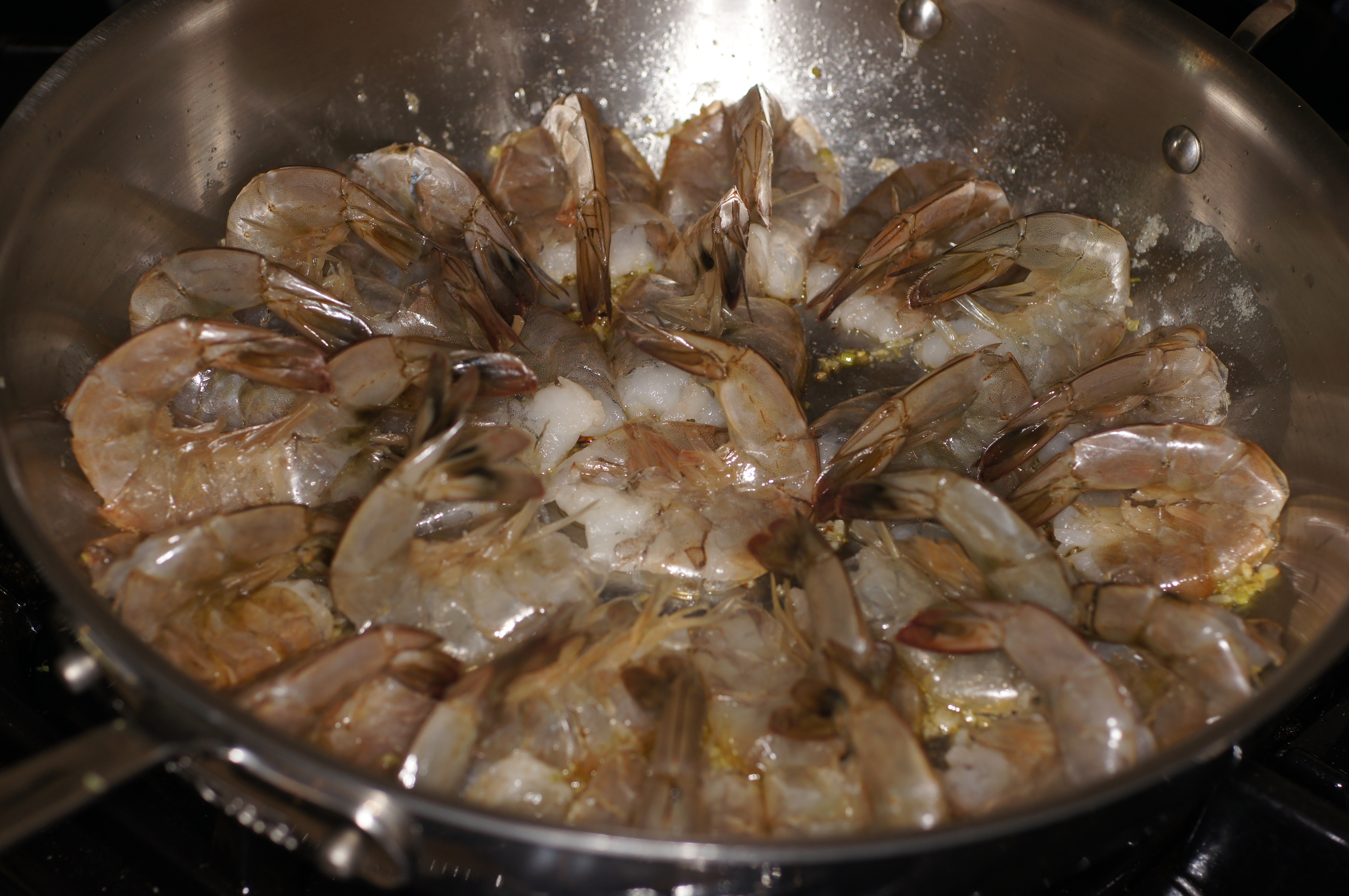Return to heat and sauté the shrimp over medium heat. When the shrimp begin to turn pink on the bottom, add the lemon juice and cover until just done, roughly 2 minutes.