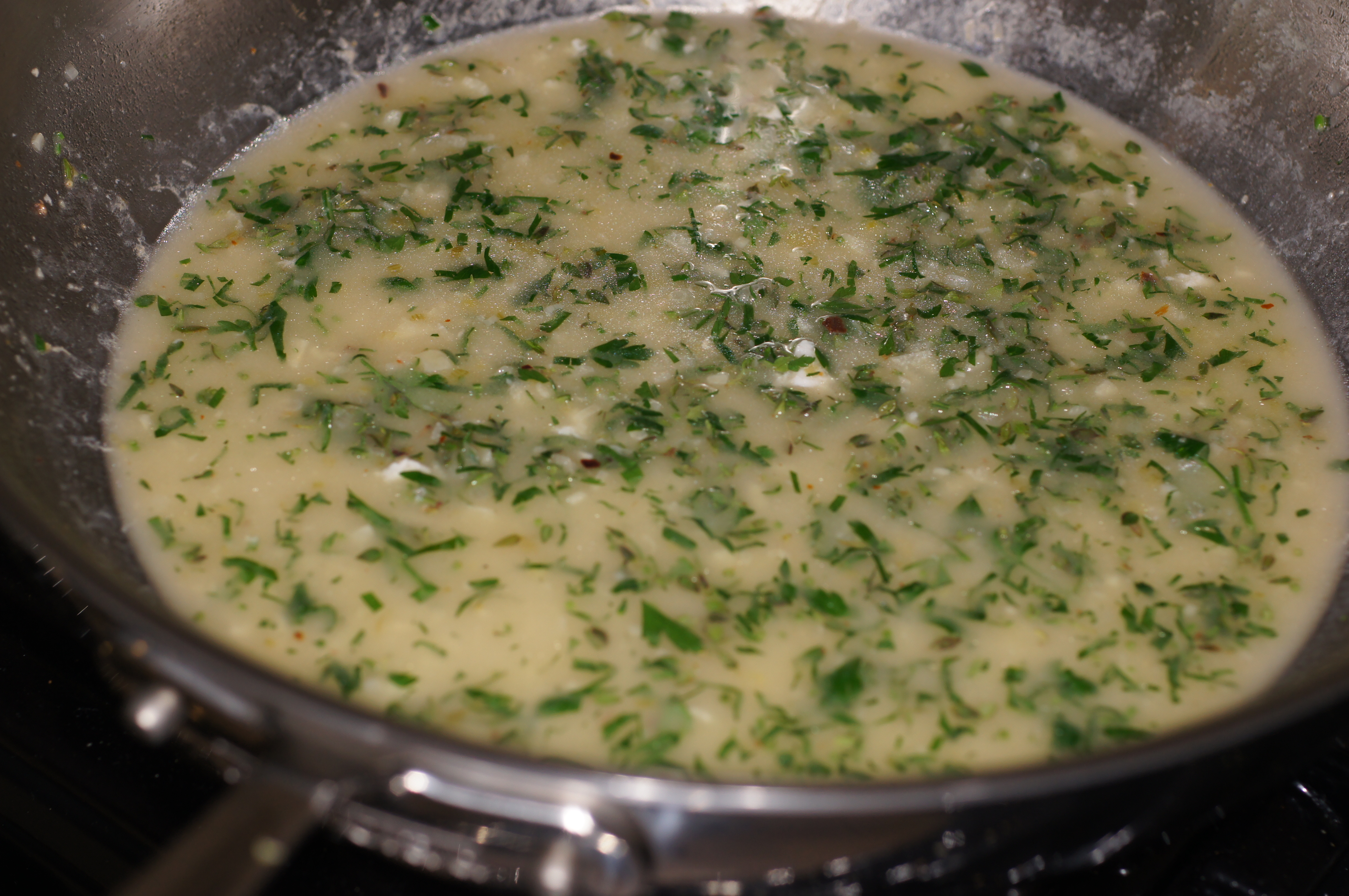 Heat oil and butter in a large skillet over medium heat. Add the minced scallions, garlic and red pepper flakes. Heat over medium heat for 2 minutes to quickly sauté the veggies, release the aromatics and flavor the oil.