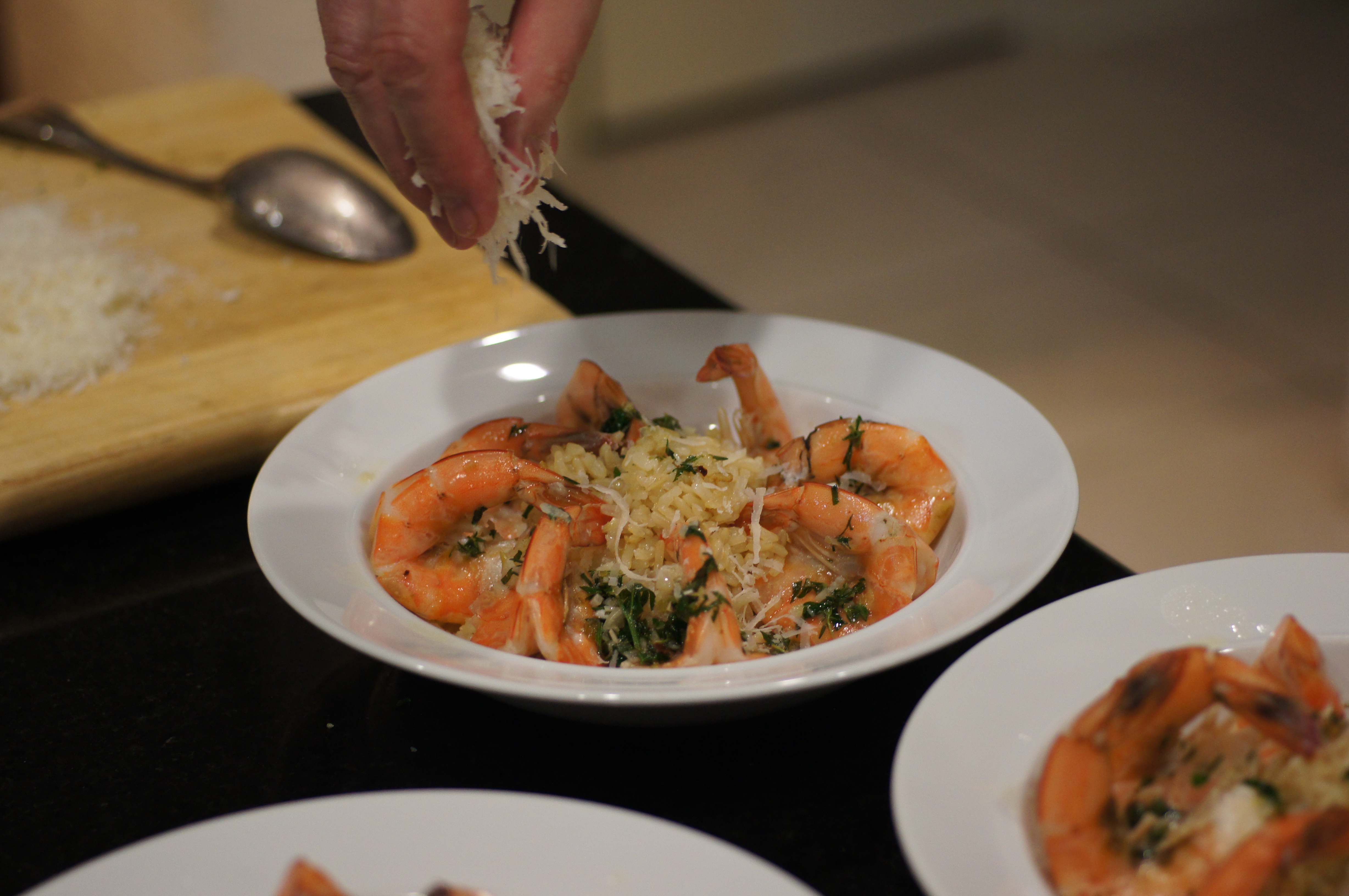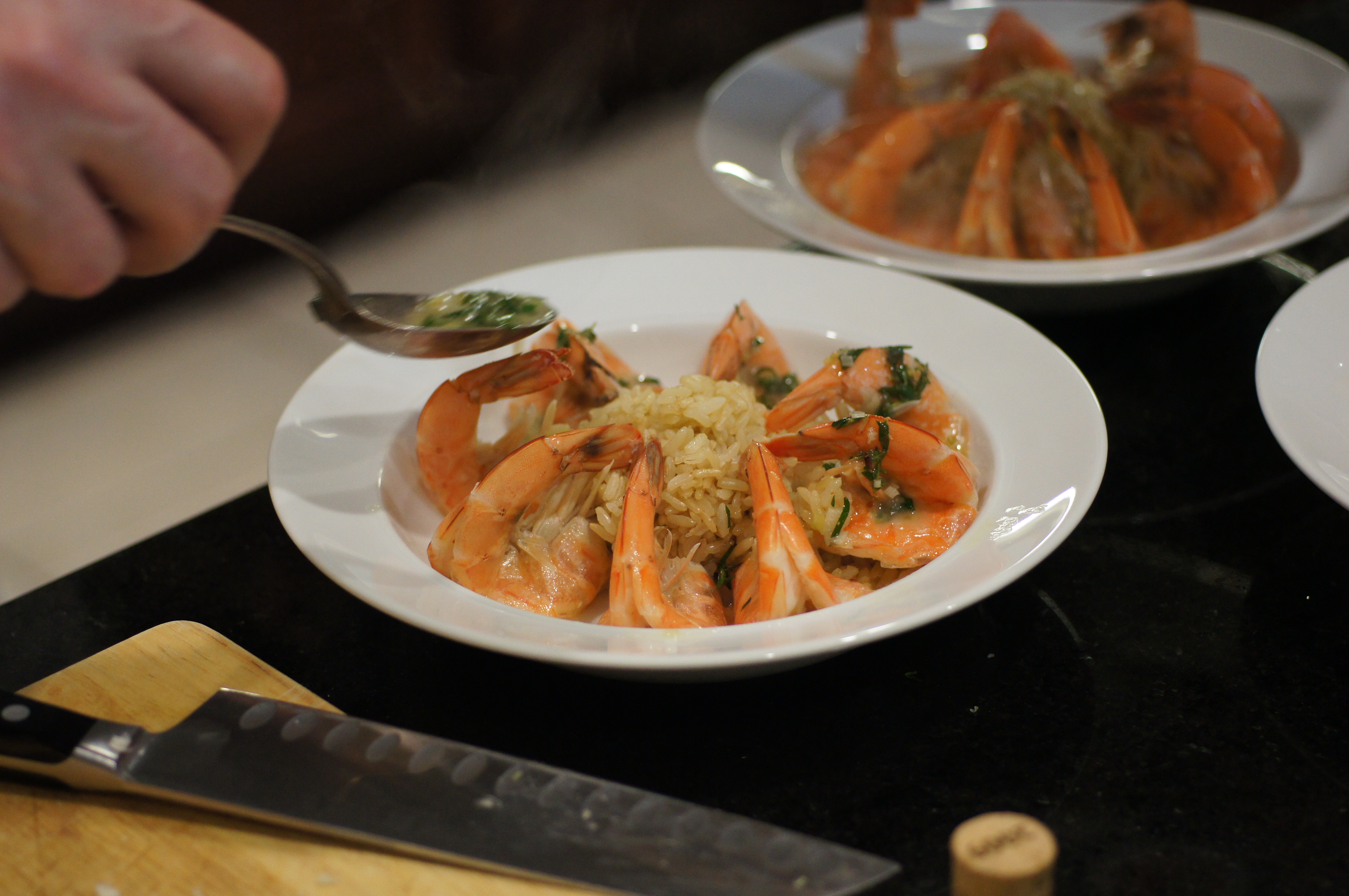 Shrimp Scampi is one of those deliciously decadent Mediterranean seafood dishes whose origins seem to be lost to history. It is also one of those dishes everyone makes and has a special recipe for. I’ve seen it prepared as an entree with nothing but bread as an accompaniment. I have also seen it served with pasta of all kinds ranging from linguini, capellini (angel-hair pasta), spaghetti, etc. This dish uses brown rice because we had it on hand as a leftover and needed to use it. However you fix it, you must have something to sop up the lovely garlicky, winey, lemony sauce that the dish produces. it is quite simply wonderful!