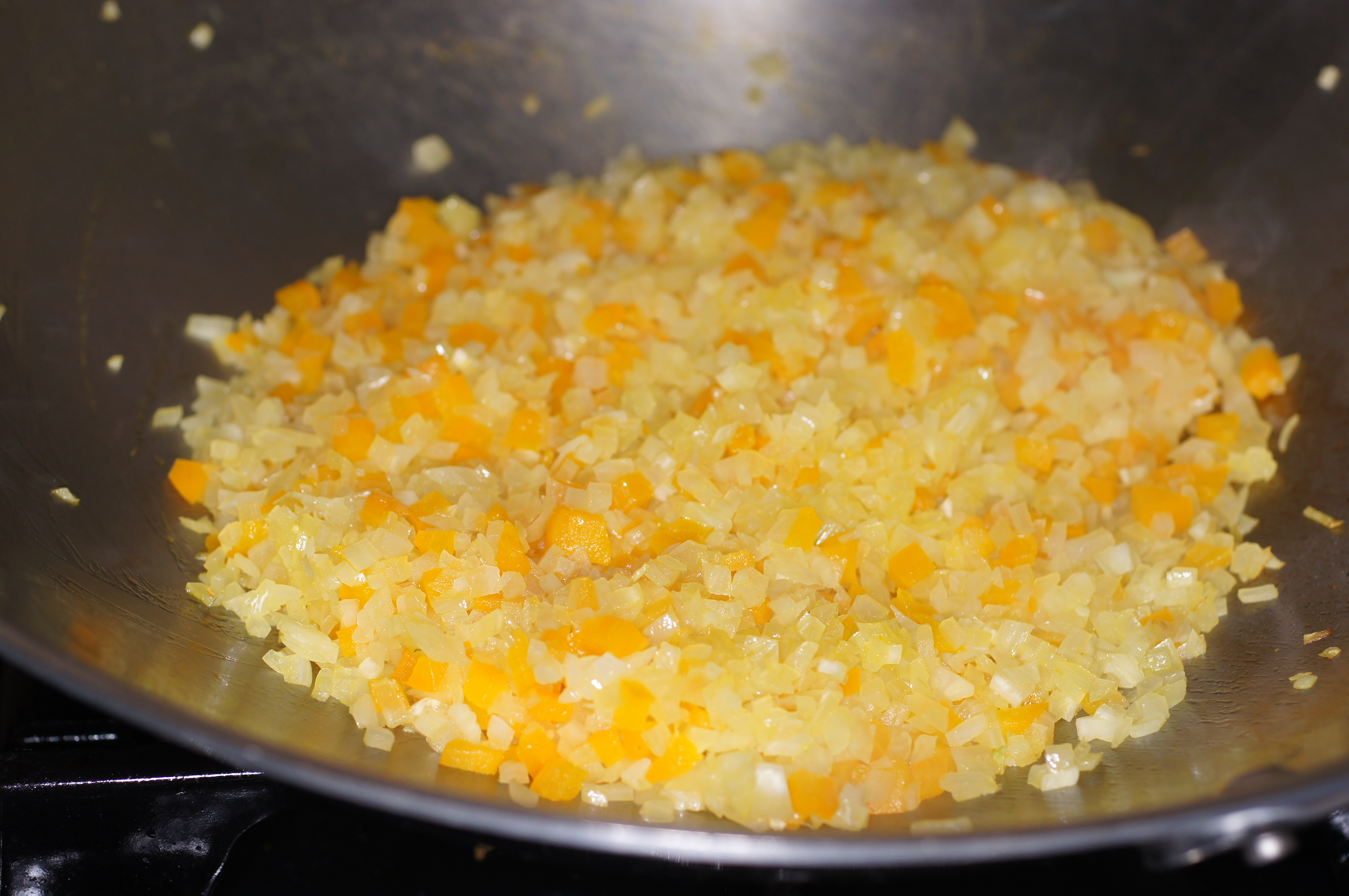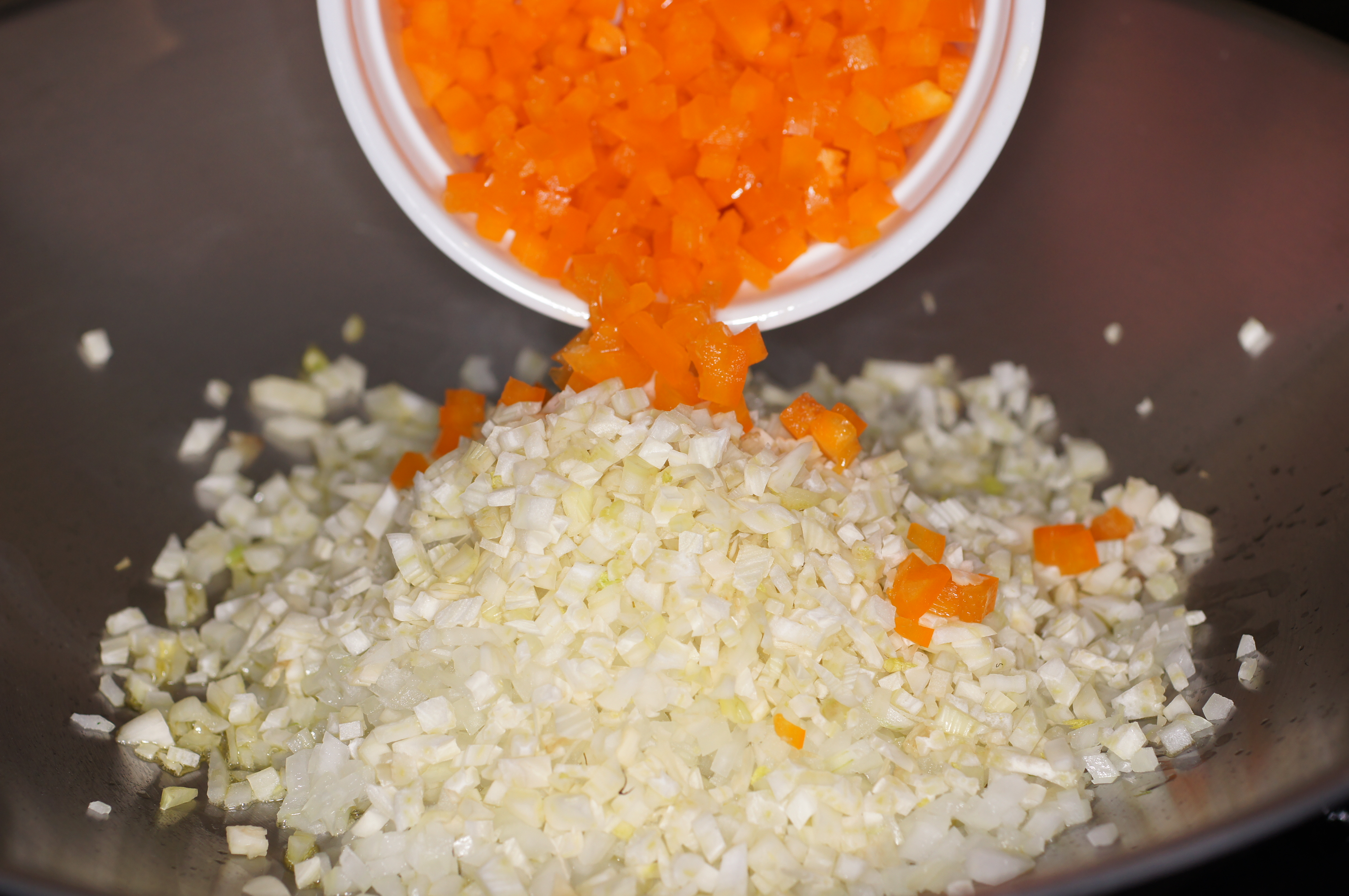 In a large skillet, heat the 2 tablespoons of oil. Add the onion, bell pepper and fennel.