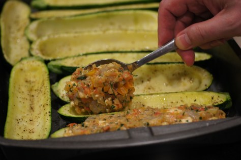 Preheat the oven to 425°. Using a spoon, scoop out the flesh of the zucchini, leaving a 1/4-inch shell all around. Rub with oil and place in a lightly oiled roasting pan. Season the zucchini shells with salt and pepper. Par cook the zucchini for 5 – 7 minutes. Remove from oven and set aside.