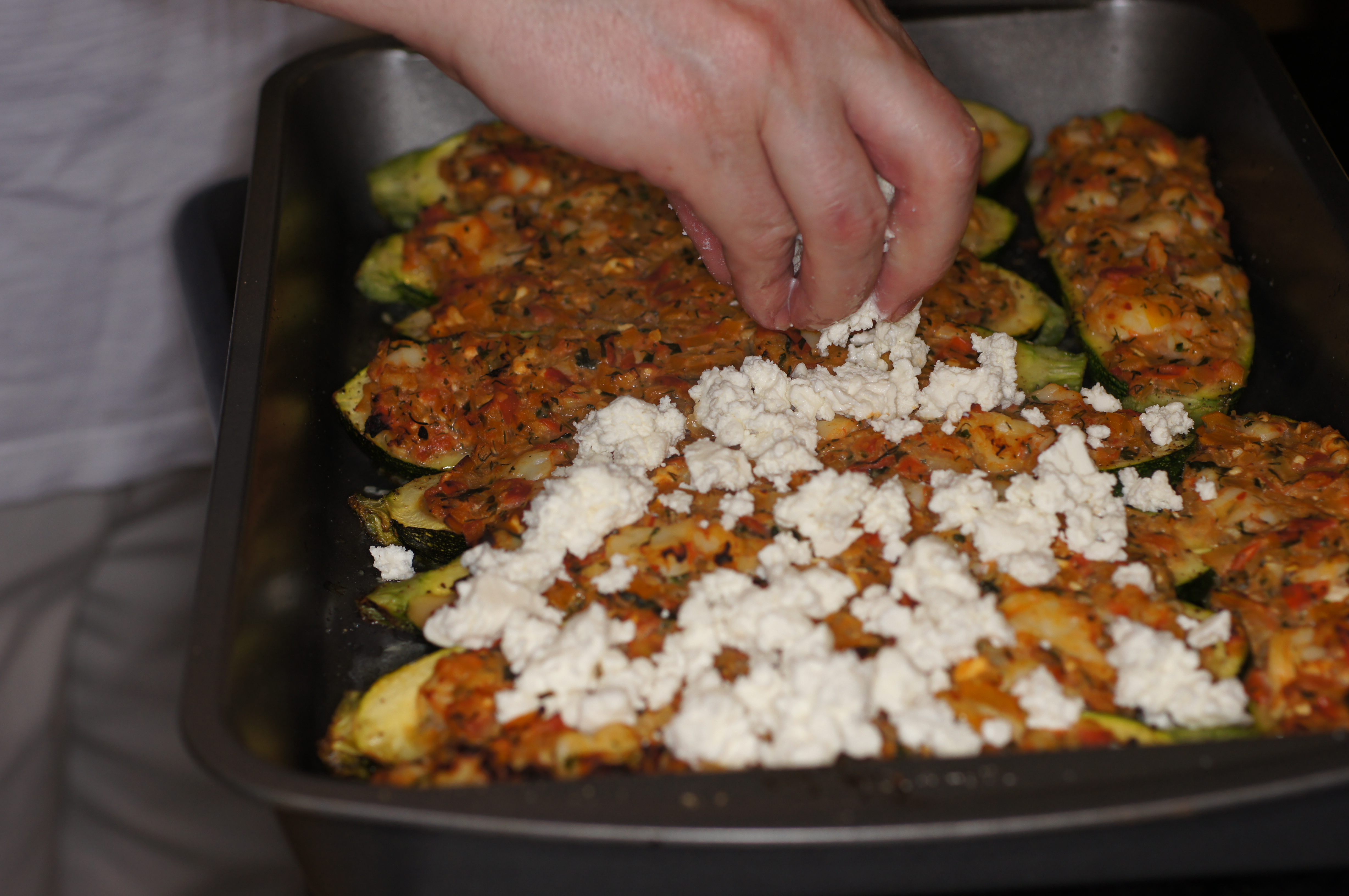 Top the zucchini with the remaining 1-1/2 cup feta.