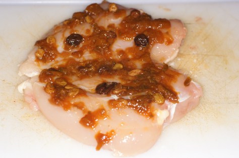 After you have boned the chicken breast, season the meat with 1/2 tsp salt. Slather 3 Tbsp peach chutney on the meat.