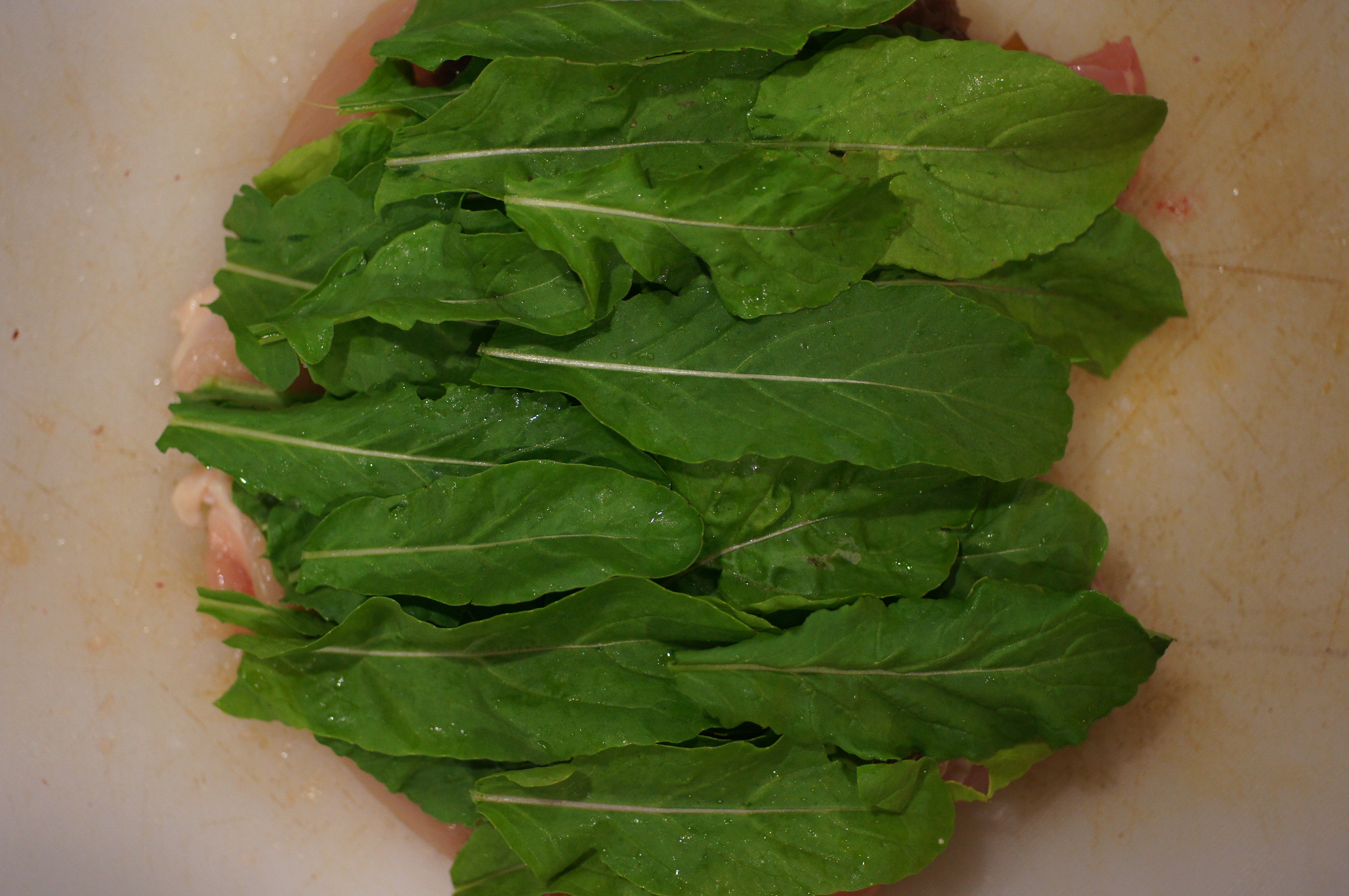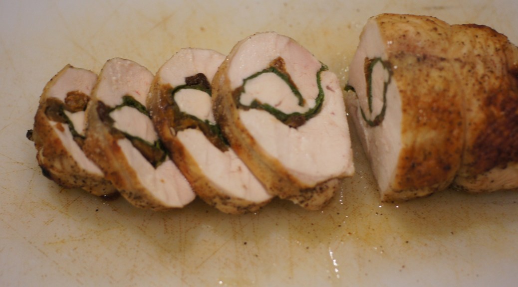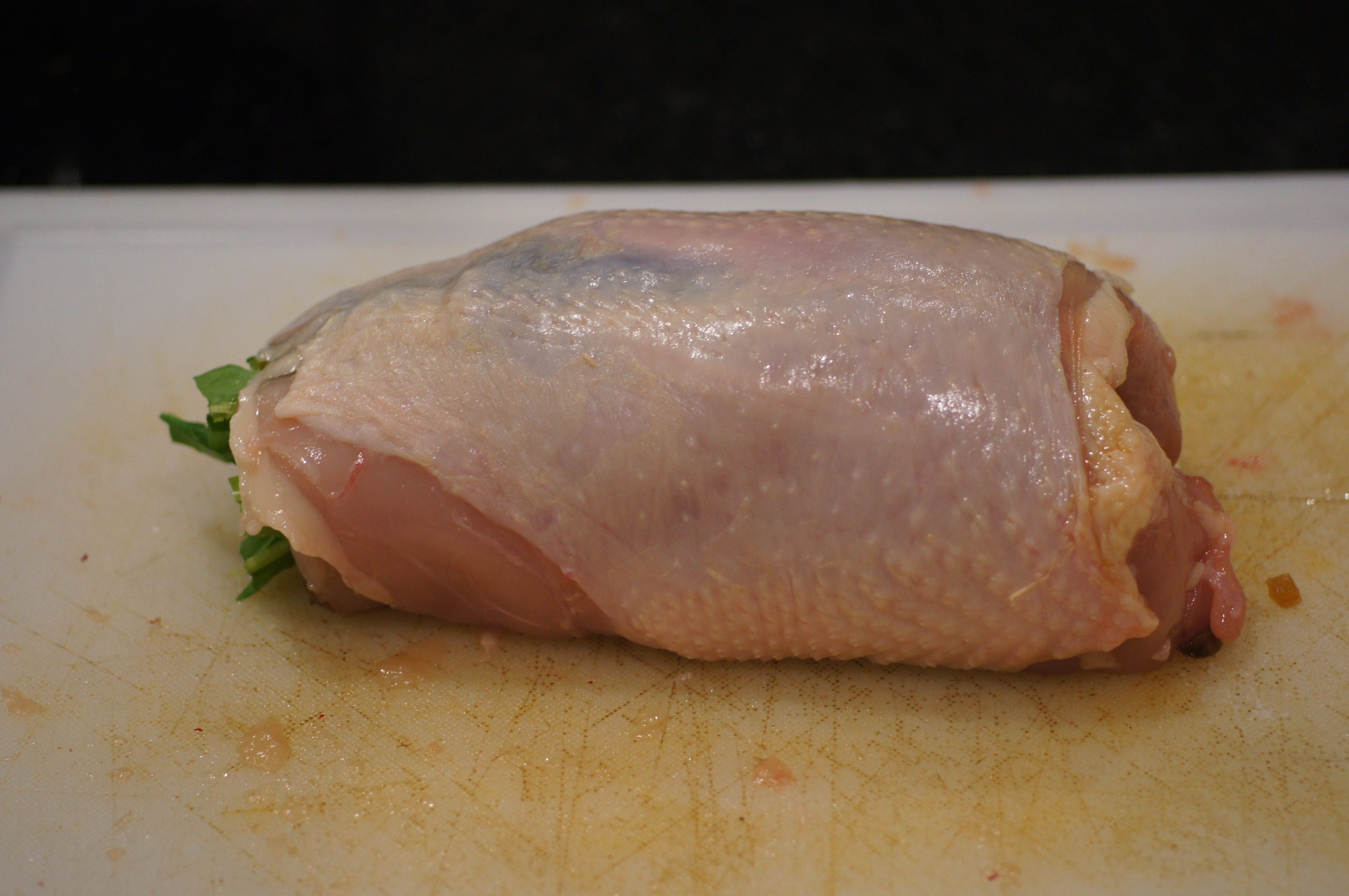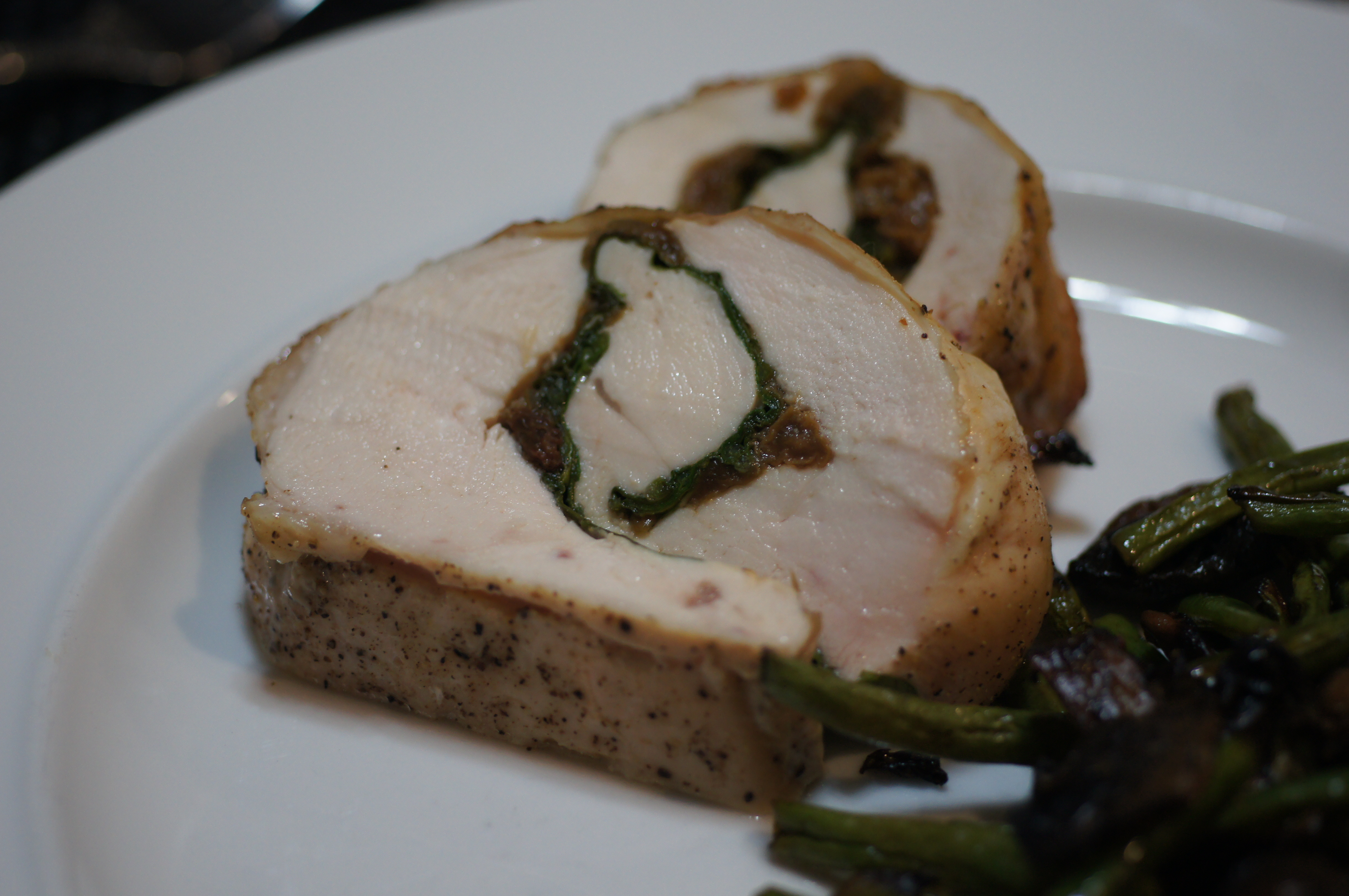 Tonight we got to try something I’ve been wanting to do. I’ve been wanting to make a chicken roulade for a while. I also knew what I was going to pair with the chicken. I have this fabulous peach chutney (recipe here) that goes well with chicken, among other things. I also have a garden full of fresh, young arugula. I felt the sweet tanginess of the chutney would pair well with the peppery bitterness of the arugula and the mildness of the chicken. It did. This was a beautiful meal with a lot of flavor, a real show stopper, well worth the time and effort. I hope you give it a try.