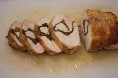 Now grab one of the sides and roll the breast pressing firmly and making sure the ingredients stay in the chicken as you roll it. This sounds harder than it is.