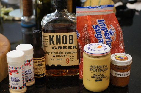 Mix all of the ingredients in a bowl to incorporate and dissolve the brown sugar. To insure the sugar dissolves, it’s best to add the bourbon first, then the sugar and mix. Next, add the remainder of the ingredients and incorporate.