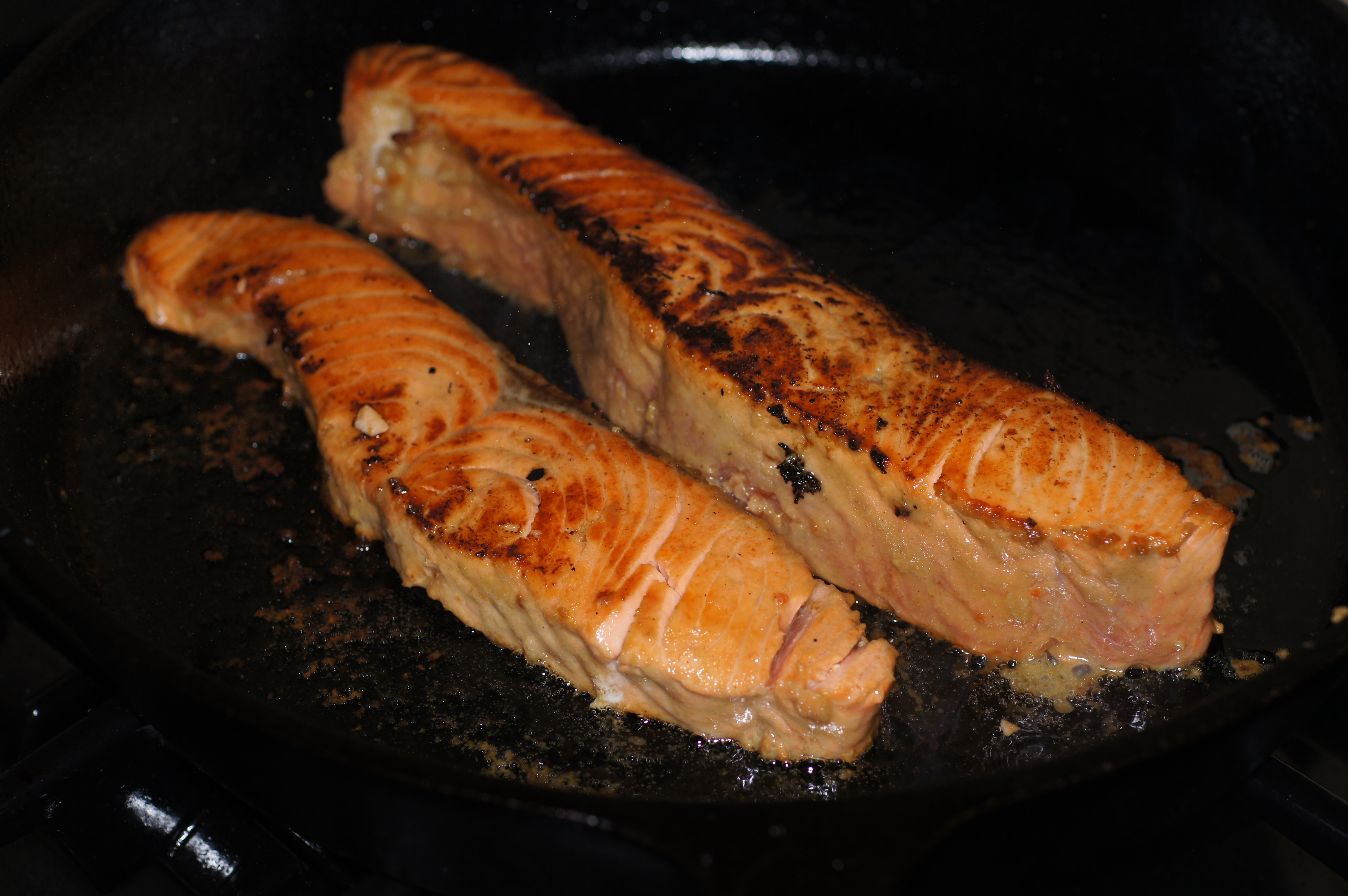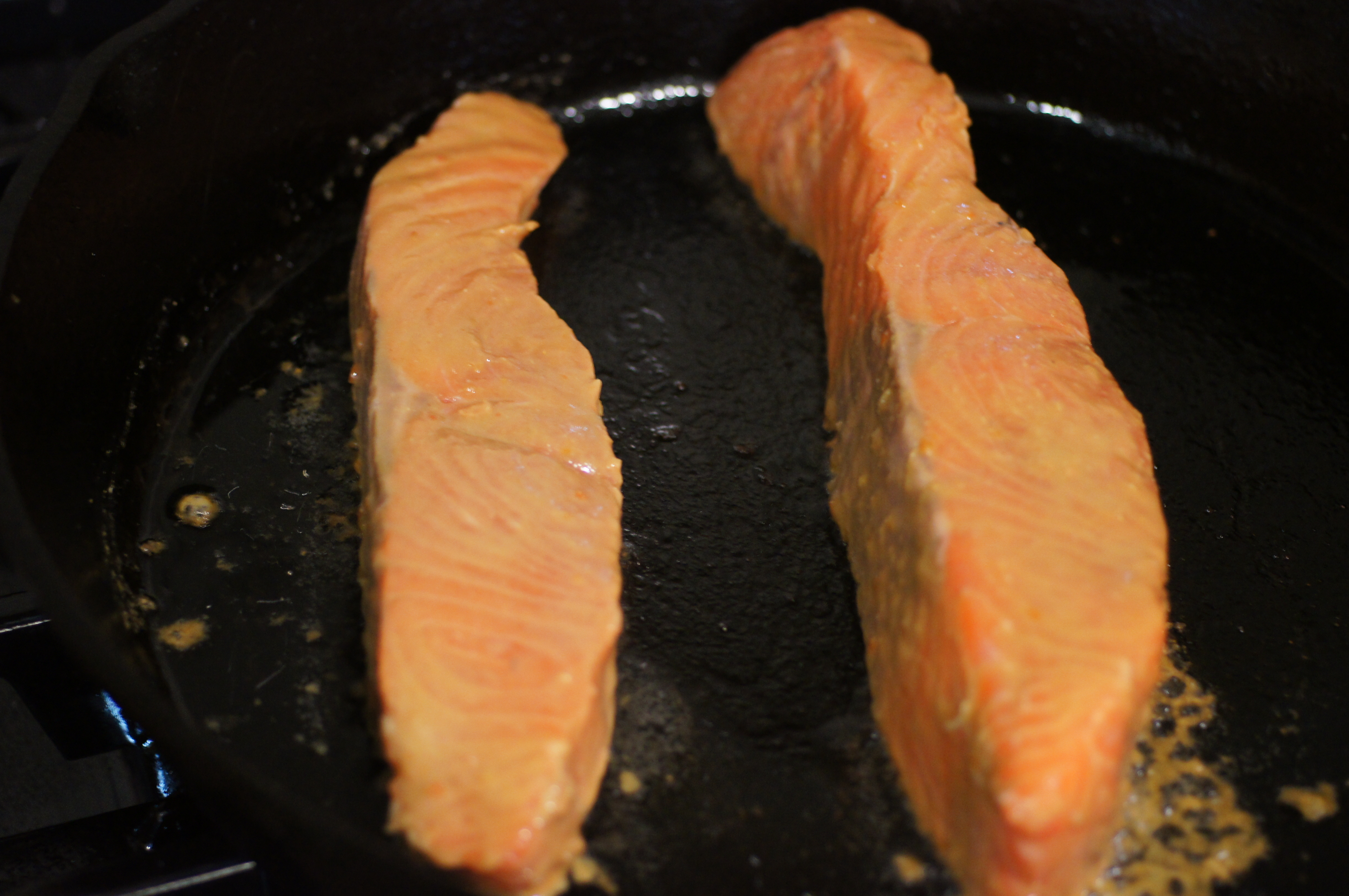Depending upon the thickness of your filets and how done you like your salmon, cooking time will vary. The filet on the left was roughly 7 oz and 3/4 inch thick. It cooked 4 minutes on this side. The filet on the right was 14 oz and roughly 1-1/4 inch thick (Baby Lady and I split this filet). It cooked 6 minutes on this side before I flipped it.