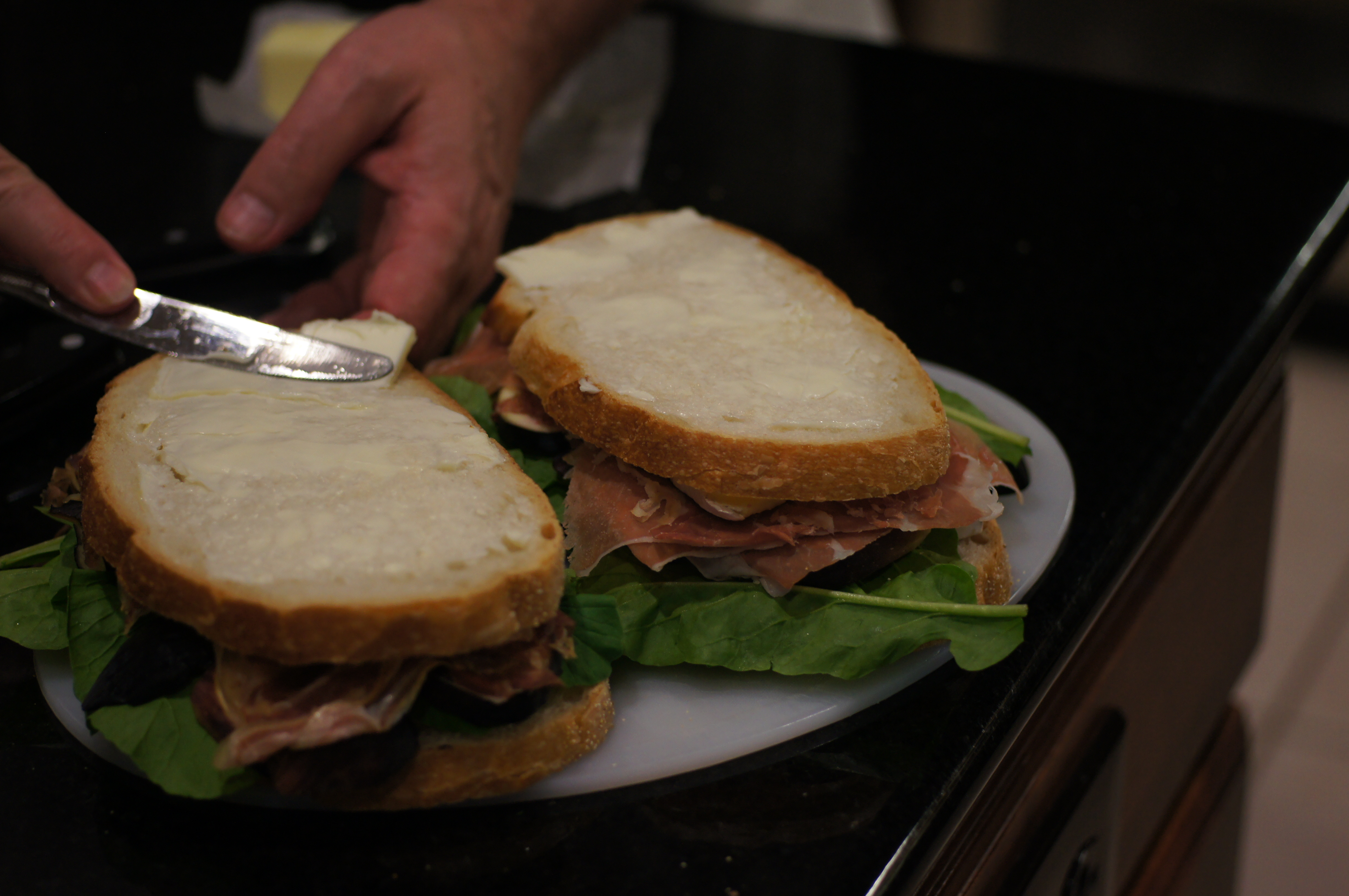 Put the arugula covered slice on top of the figs and prosciutto slice and butter both sides