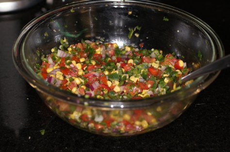 When Baby Lady came home last night, I had thawed out some nice salmon for dinner thinking I would make a nice salmon dish. Baby Lady saw the salmon and had other ideas. Baby Lady wanted a nice salad with her corn salsa. This is what we had and boy was it good! The salsa was the perfect accompaniment with the salmon and greens. The liquid of the salsa (lime juice and natural juices of the corn and tomatoes) served as the dressing for the salad. It was just incredible. We also have about a cup of corn salsa leftover for a later use during the week. Sweet!