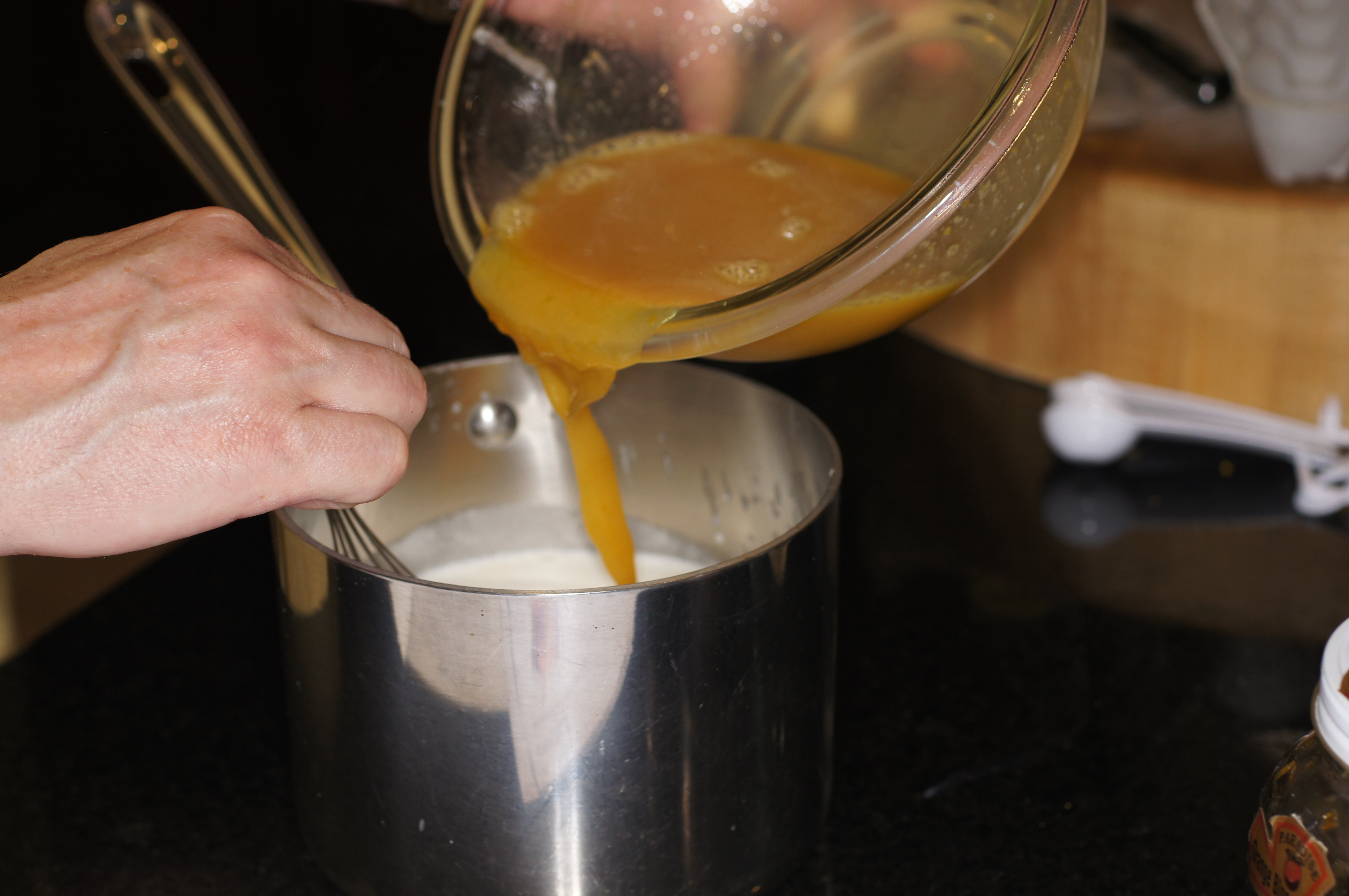 Next, temper the egg yolk custard mix by whisking in about 1 cup of the heated dairy.