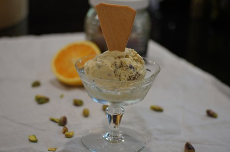 Have you ever wondered who makes up National whatever months? So have I and the answer isn’t quite clear. As I understand it, each advertising collective has its own month—e.g., January is National Beef Month, February is National Potato Lover’s Month, March is National Peanut Month, etc. But June is National Dairy Month, so how is it that we then have National Ice Cream Month in July? I’m sure there are tremendous political pressures in DC with inherent hounding of our busy reps by the various ice cream special interest groups. But somehow, some way, these lobbyists always come through in the end. That’s why in 1984 Ronal Reagan (the “Jelly Belly President”) made July National Ice Cream Month. Not only did he succumb to tremendous political pressure to make July National Ice Cream Month, but he went even further and designated the third Sunday of July National Ice Cream Day. So today is that feted day whereby all Americans are to go to their local ice cream parlor and partake of that deliciously creamy, cool comestible, or alternatively crank up the old ice cream maker and make your own. So in honor of the day and month, we urge you to try this delicious treat. It is not too sweet, has a nice but not overpowering flavor of orange while allowing the honey flavor to come through with a nice little crunch of caramelized pistachio. It’s a very delightful treat meant to cool you off in the heat. We hope you give this one a try.