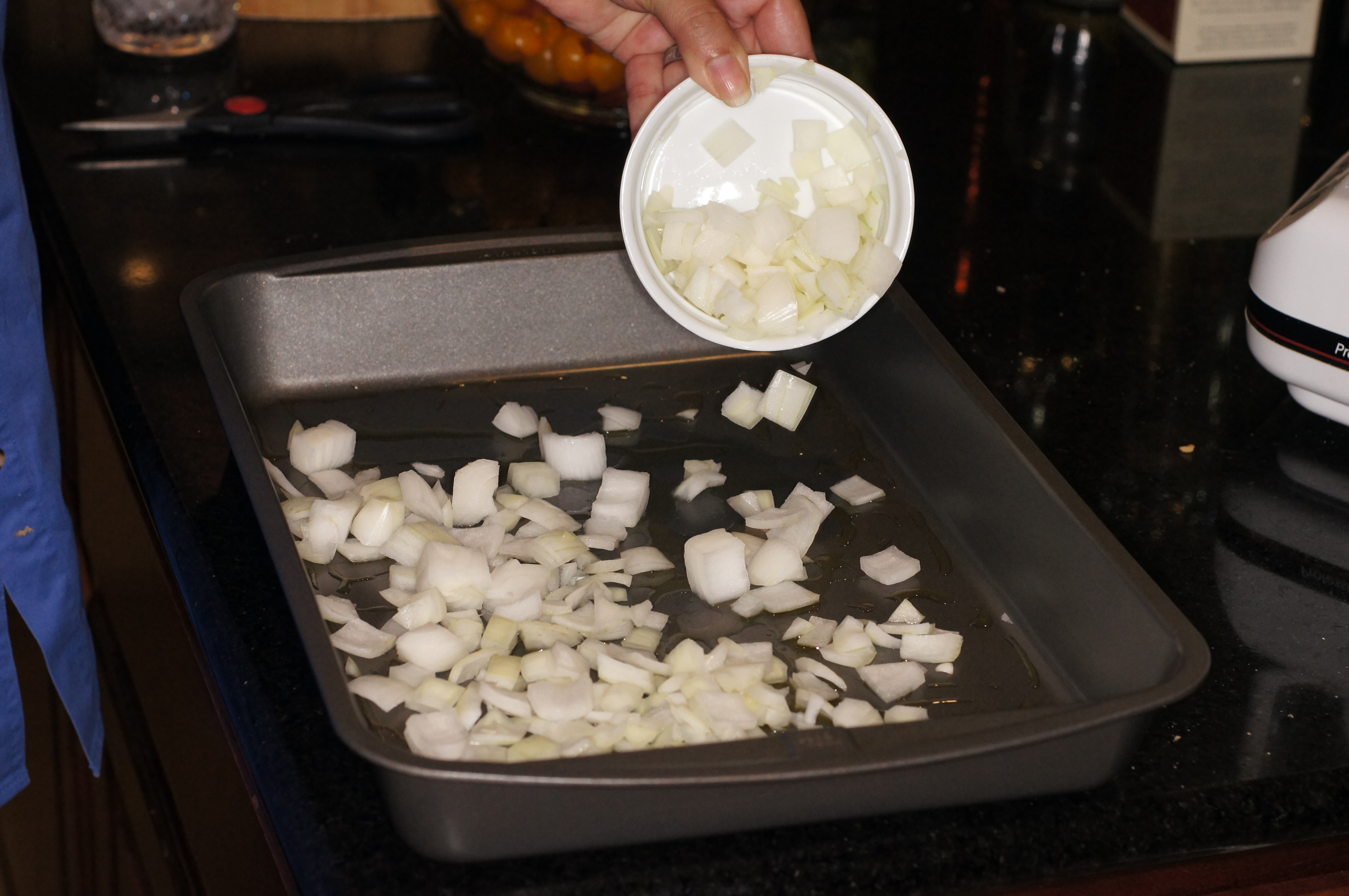 First thing first, lightly oil an 13 x 9 baking pan. Add the onions