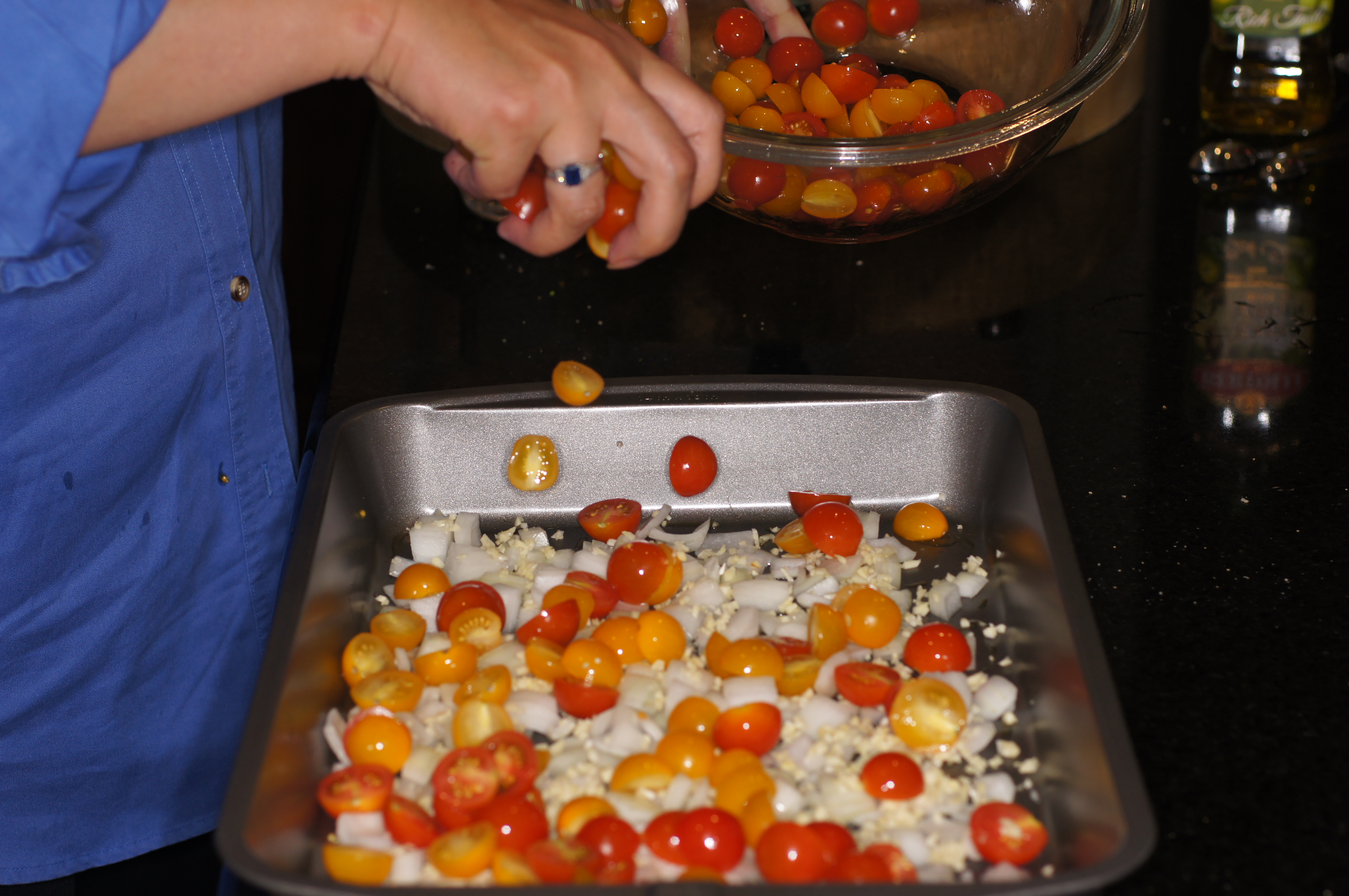 We love tomatoes, especially in the summertime when you can get fresh tomatoes wherever you go. We make lots of salads during the summer using the tomatoes as the centerpiece. We also bake them for a nice side vegetable. They are so abundant and so flavorful, we try to use them in all sorts of ways. One of the ways to pack a lot of flavor into dishes heavily relying on vegetables is by roasting them. Roasting adds another dimension to food. With vegetables, it has a tendency to round out their flavors to make them more mellow while simultaneously bringing out the natural sweetness in them. Roasting cherry tomatoes concentrates their flavor and natural sweetness while mellowing out some of the acidity and brightness. Nonetheless, they still have a nice little bite to them. Roasting garlic tends to mellow the harshness of the garlic leaving a sweet, tasty morsel with a ton of flavor. Roasting onions removes their bite leaving only a sweet tasty tidbit behind. In this recipe, we roast cherry tomatoes with the addition of garlic, onions, olive oil, and crushed red pepper flakes. The result s a powerfully flavorful but mellow dish with the natural sweetness of the veggies coming through. Coupled with the breadcrumbs, parmesan cheese and fresh basil at the end you have a very satisfying, simple and quick pasta dish.