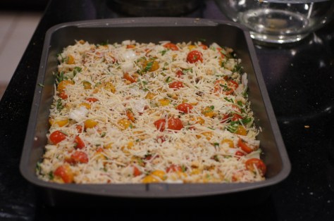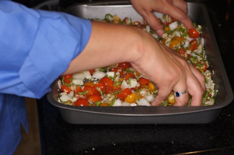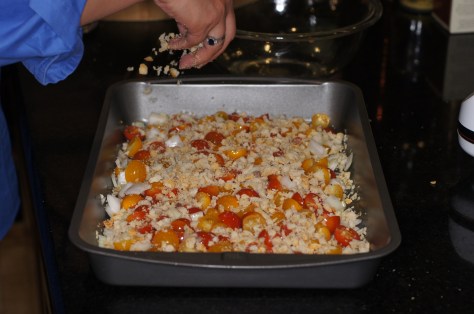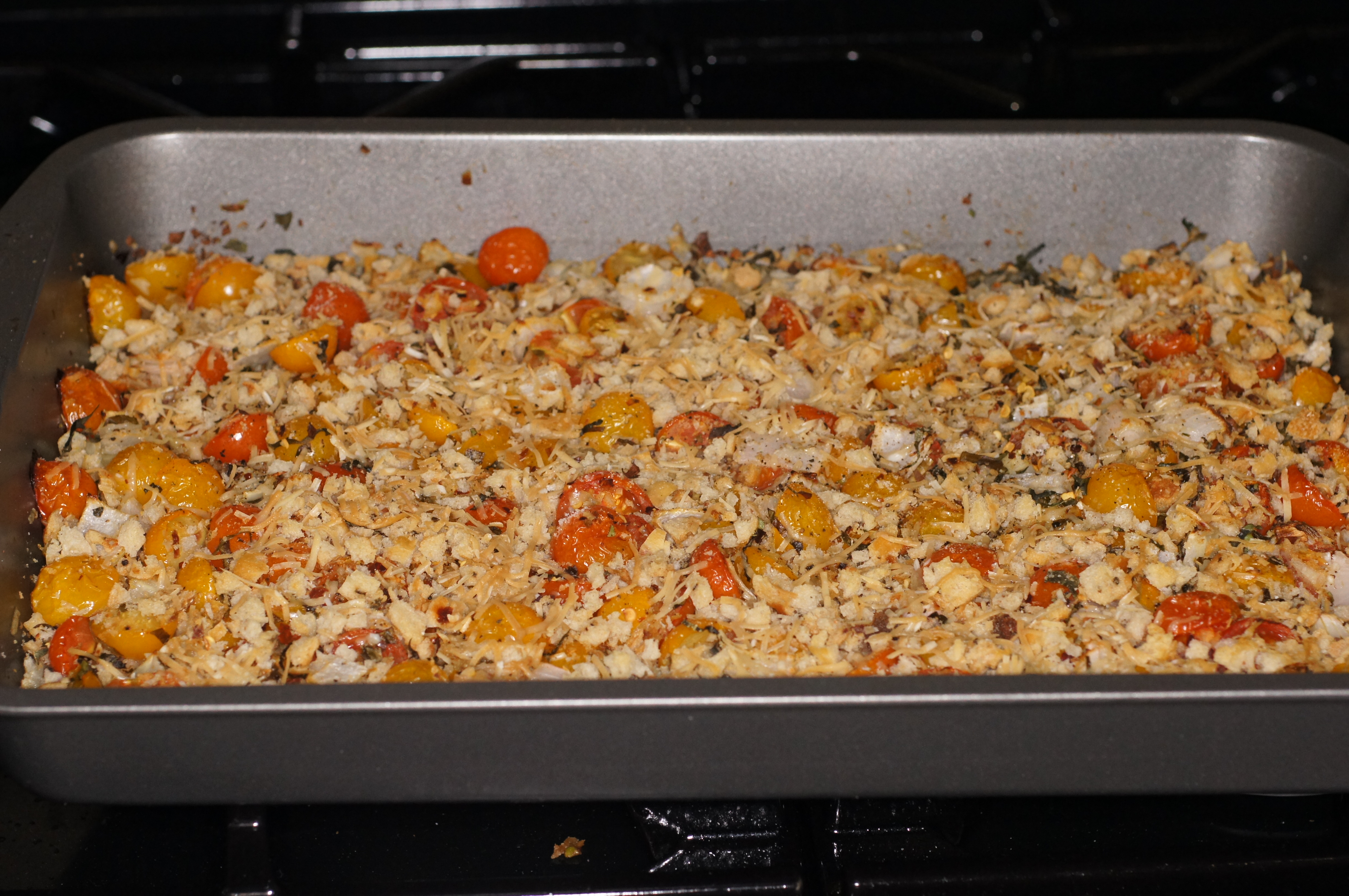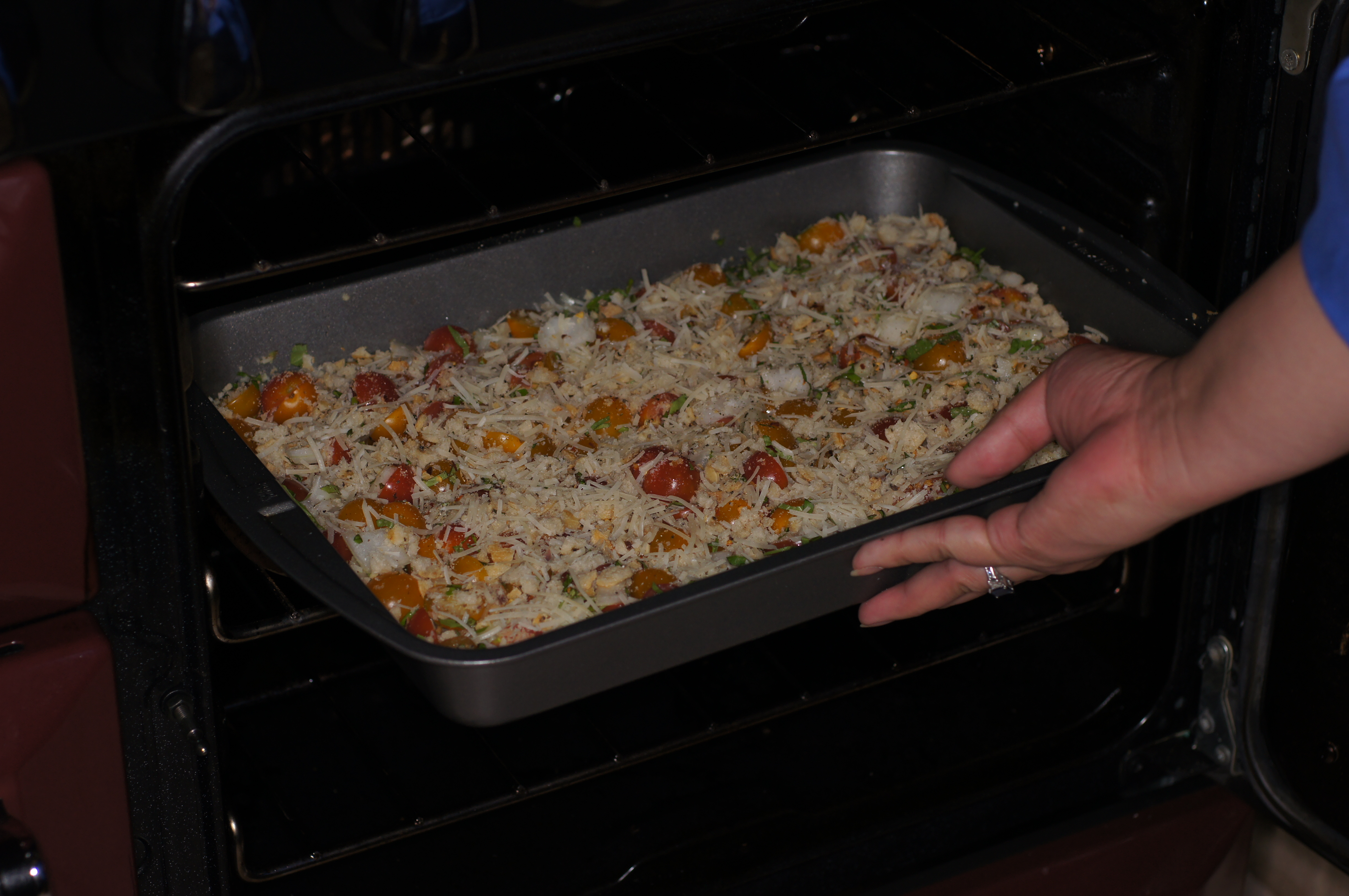 Using your fingers, work the top layer of breadcrumbs, crushed red chile flakes, parmesan and basil down into the layer of cherry tomatoes, onion and garlic.