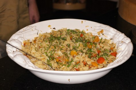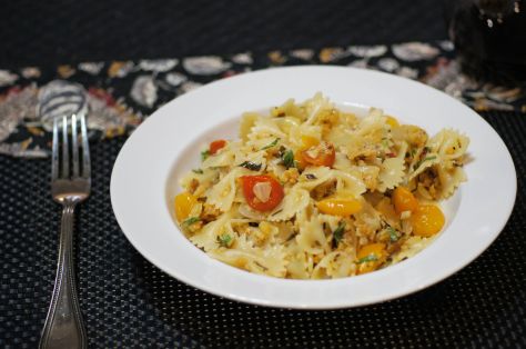 • 1 lb farfalle (Bow tie) pasta (You can use others, i.e. penne, fusilli, gemelli. I prefer the farfalle)