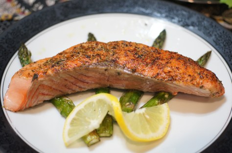 To Plate: Remove the skin from the salmon, Place 4 asparagus spears on the plate with the tips facing the rim of the plate. Place a salmon filet on top of the asparagus. Drizzle the salmon with 1/e lemon, juiced. Slice a lemon slice in half and twist for garnish. Serve with a nice garden salad and enjoy!