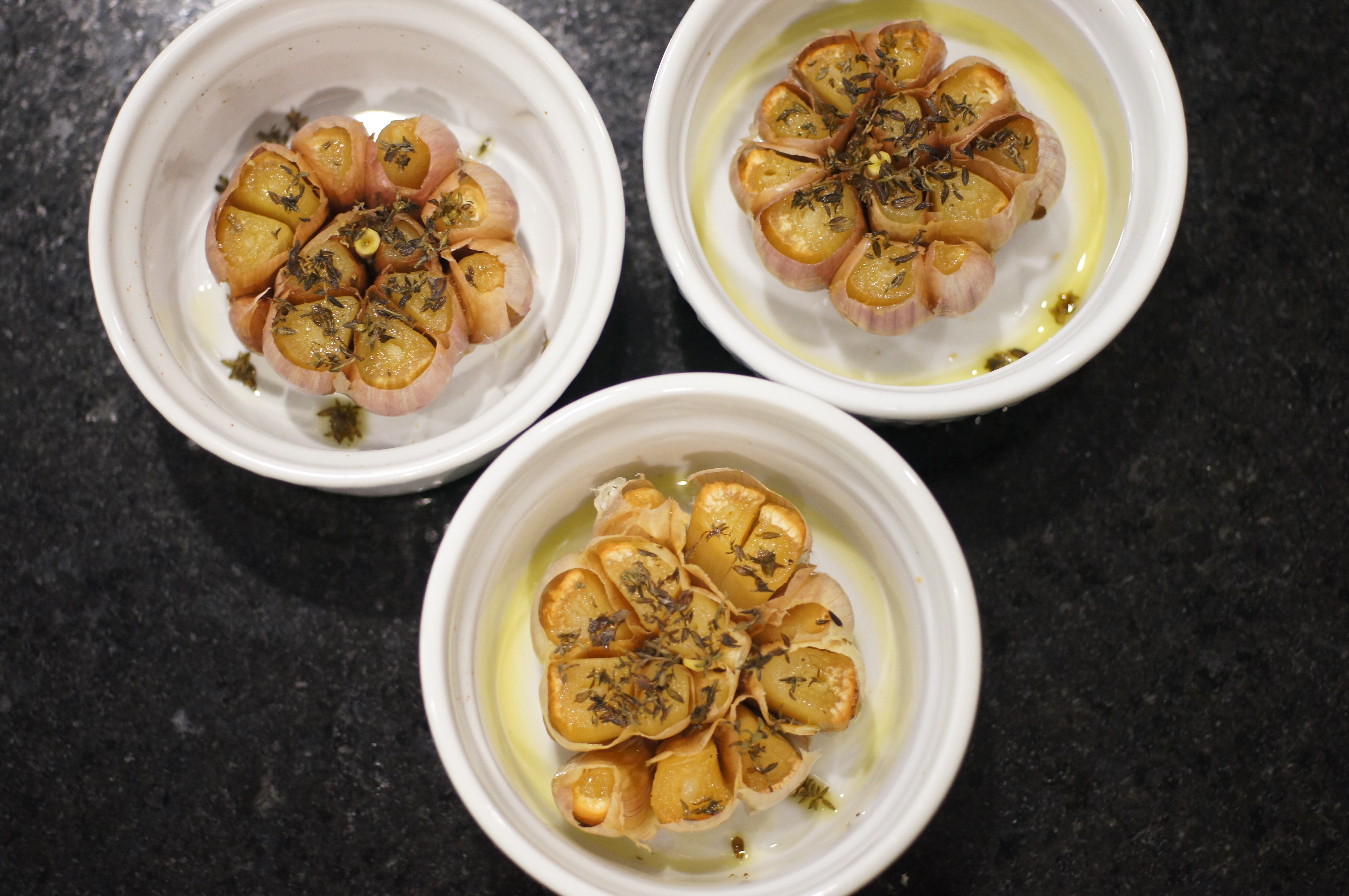 Place garlic head in ramekin. Drizzle with 1 Tbsp of olive oil and the leaves of 3 sprigs of fresh thyme.