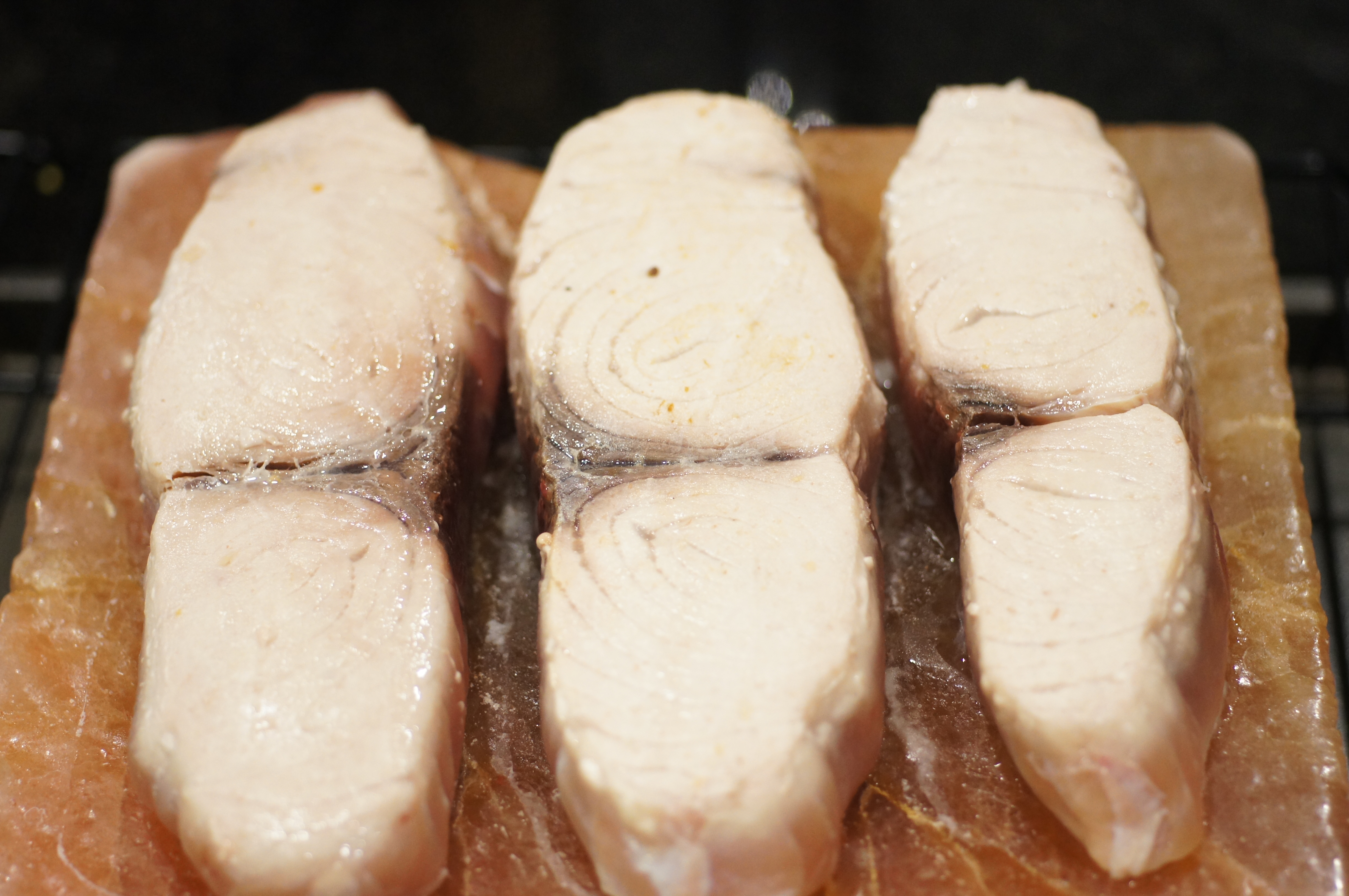 About 8 – 10 minutes from the broccoli being ready, remove the salt block from the heat and put on a trivet or baking rack (I use a baking rack) with either a towel or a pan underneath to catch the drippings. Place the striped marlin on top of the salt block and cook for 3 – 4 minutes, depending upon how done you like your fish.