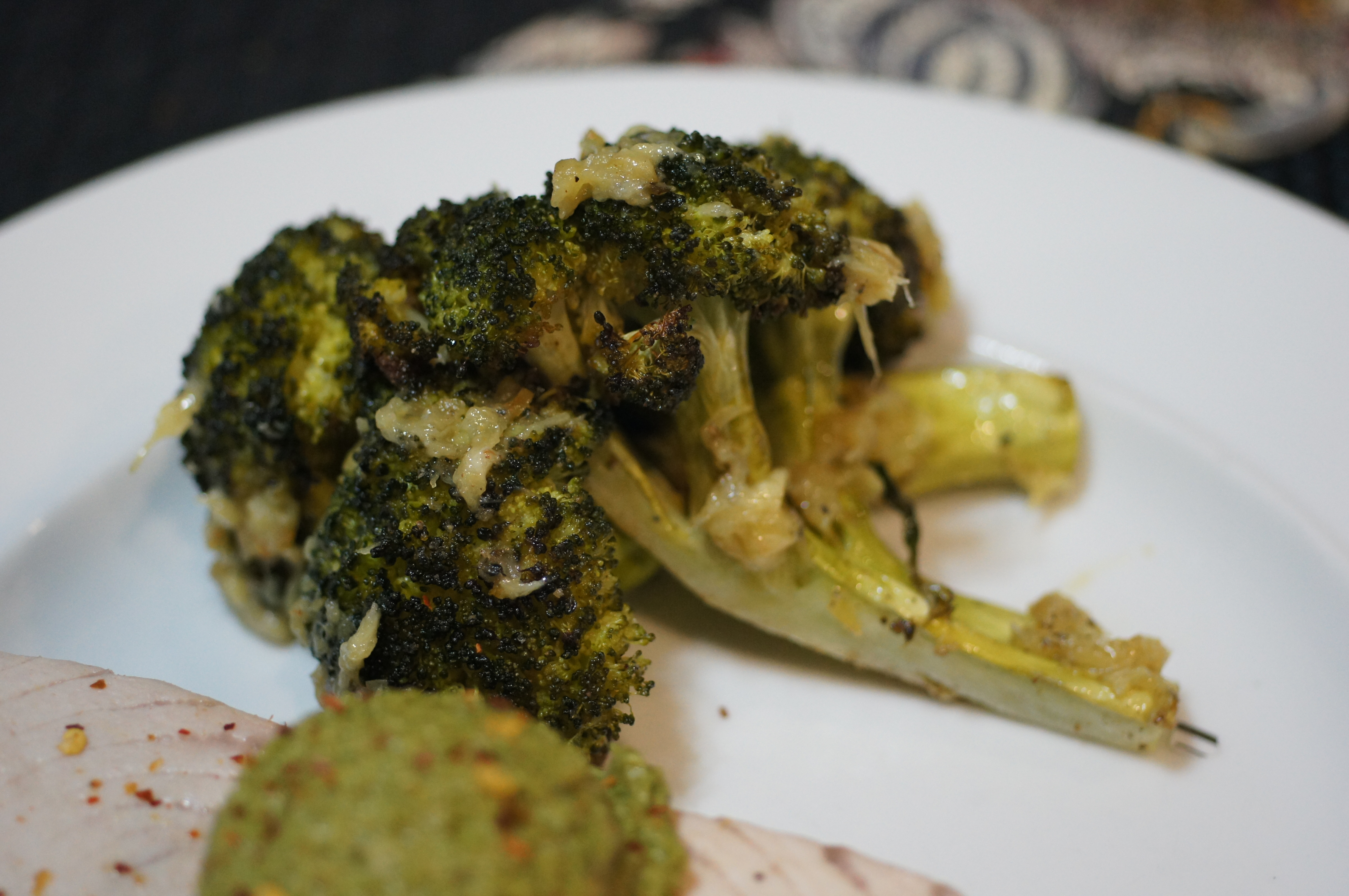 The other technique we used last night was roasting broccoli and garlic. Sautéing or steaming veggies yields a tender, mild and sweet flavored veggie. Roasting vegetables, however, makes them more robust. You still get the tenderness but with a little singe around the edges, resulting in a crispiness with a more intense, nutty flavor with a little sweetness from the caramelization of the natural sugars in the veggies that results from roasting. Also, roasting is remarkably easy. It’s the technique of putting something in the oven and walking away for a while. It really does’t get much easier than this. All you need is a little salt, pepper, olive oil, heat and surface area. Surface area is probably the most critical thing although heat also makes a difference. For instance, the higher the temperature you roast your vegetables, the more singed they become and the quicker they roast. As pointed out in Roasted Cauliflower with Red Chile, Cilantro & Lime, slow roasting allows the food to absorb the seasoning while it becomes tender with a nice touch of brown color, a little sweetness from the caramelization of natural sugars and a little singe from the process. The higher the temperature the less the natural sugars will caramelize but the crispier the result will be. Also, higher temperatures may not provide sufficient cooking time to provide a tender vegetable. Adjust your heat and time however you prefer.