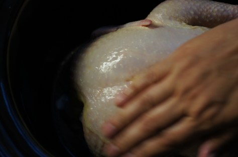 Add 1/2 cup water and cook the chicken on high for 4 hours until the chicken easily pulls from the bone.