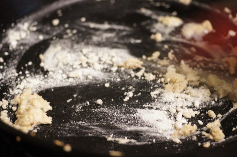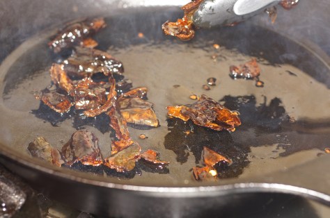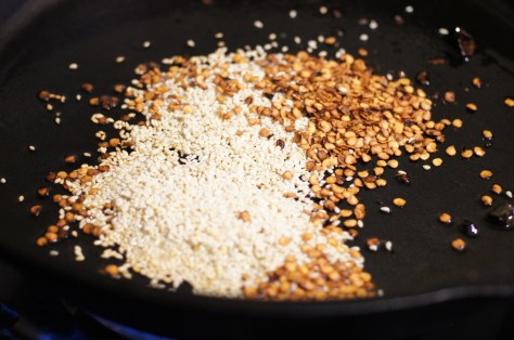 In the same oil fry the sesame seeds, and the leftover chile seeds. Remove from heat and set aside.
