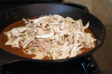 Return half the sauce to the same pan and add shredded/pulled chicken.