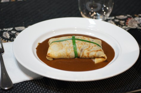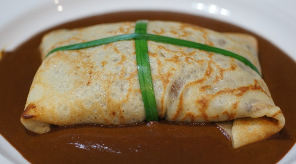 The flavor of pasilla chile is vastly different from ancho chile. Ancho chile is a ripened, dried poblano chile, a medium hot chile (2,500 – 3,000 Scoville units), that has a rich, fruity, sweet and pungent flavor. The pasilla chile, on the other hand, is a dried chilaca chile, a medium-high hot chile (5,000 – 15,000 Scovile units) that has a rich, mellow flavor that is desirable in cooked sauces, or toasted and crumbled, or ground into a table sauce. Not only is the chile different but this mole is also a tad bit sweeter while still savory. The flavor is more chocolate than dried chile which combines beautifully with the thin crepe. Now don’t get me wrong the dried chile flavor is definitely present it just has a sweetness that couples well with the crepe. It’s a fun and different dish so if you want to try it, here’s what she did.